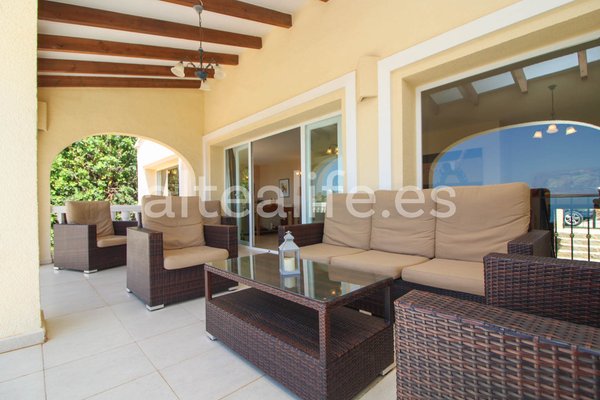 - Überdachte Veranda mit Sommer-Essbereich und Entspannungsbereich. Mit Blick auf den Pool.