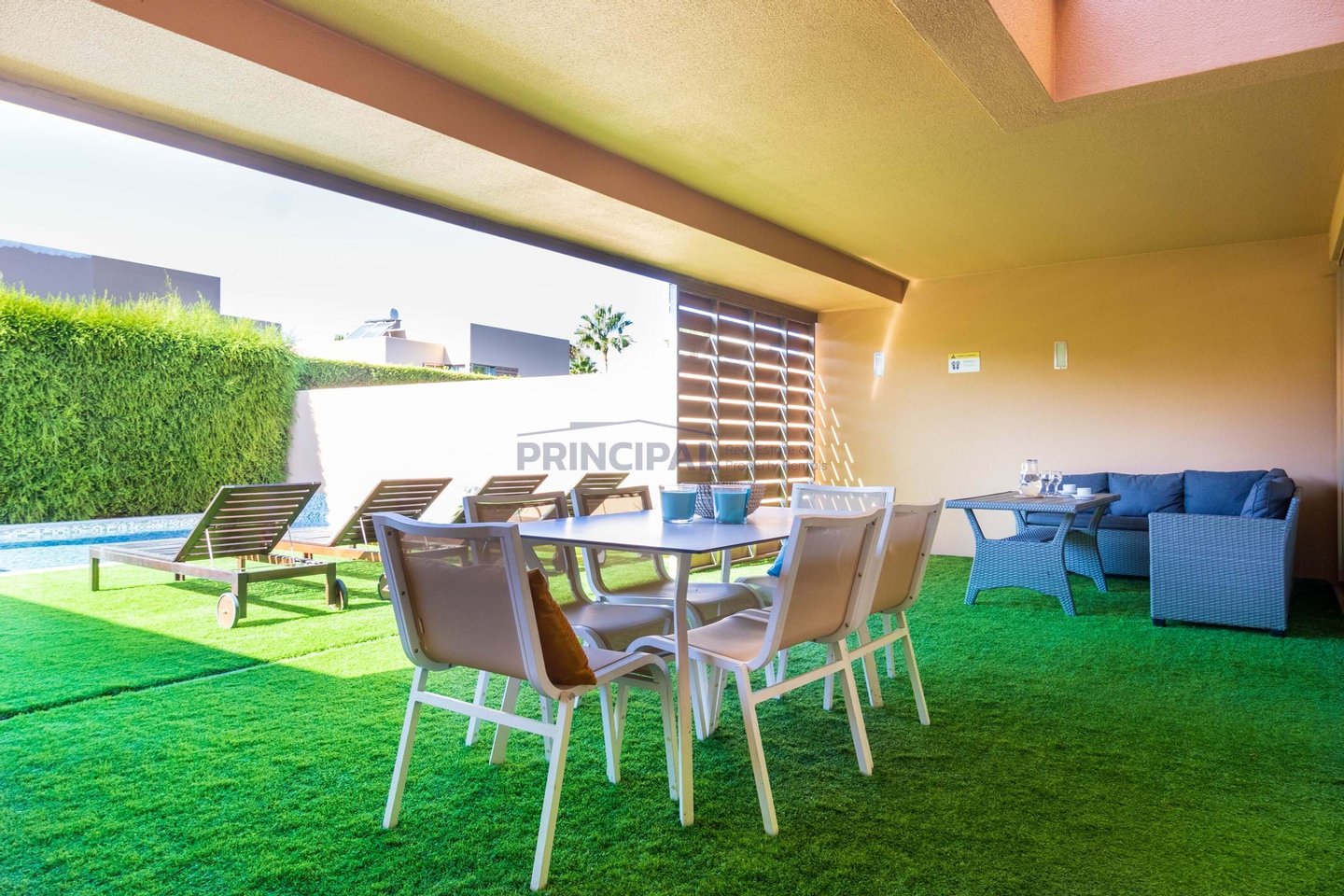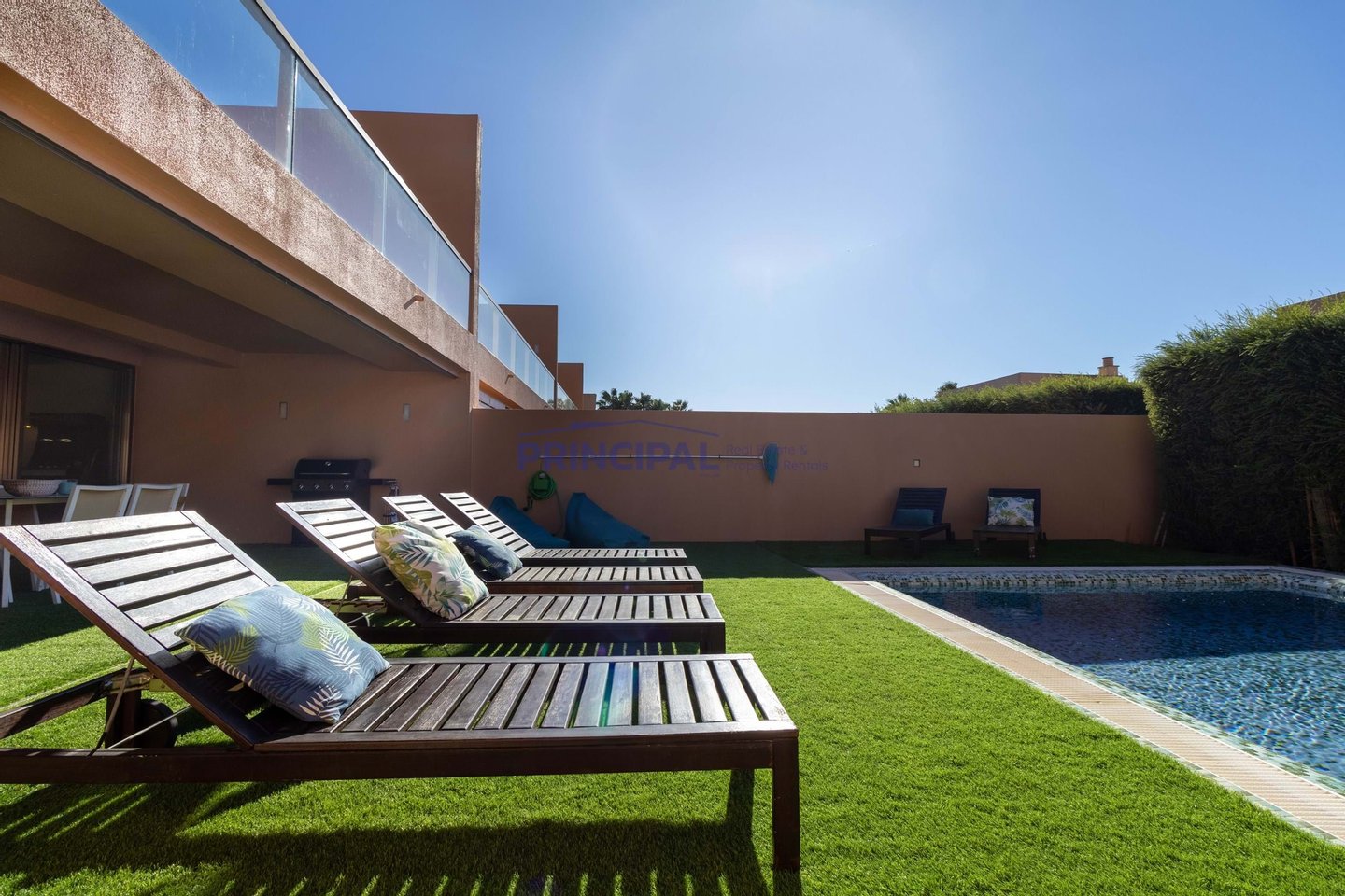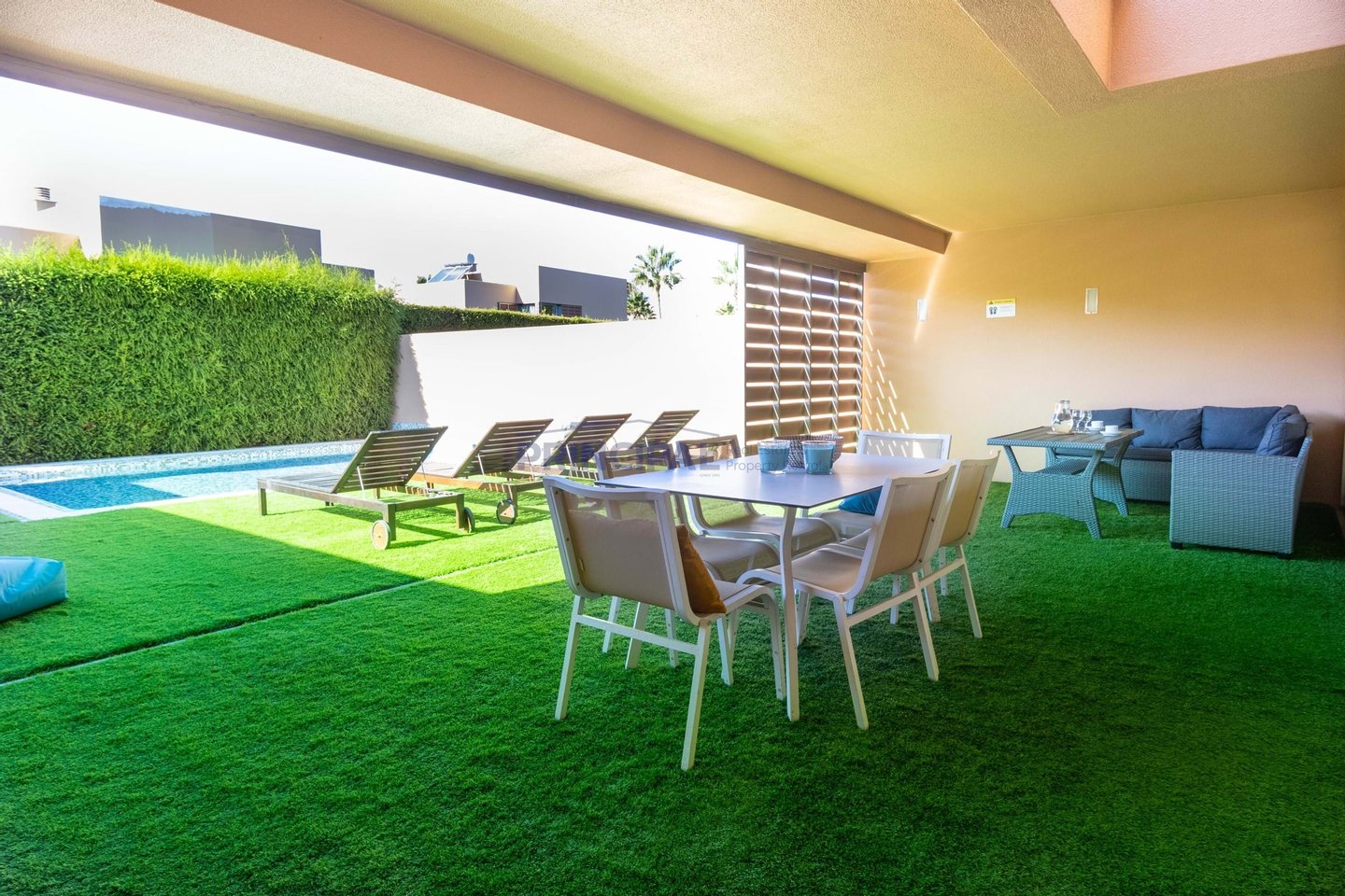 Draußen befindet sich der sonnengeschützte Essbereich und die Terrasse mit Holzböden im Terrassenstil rund um den Pool und Platz für Sonnenliegen.