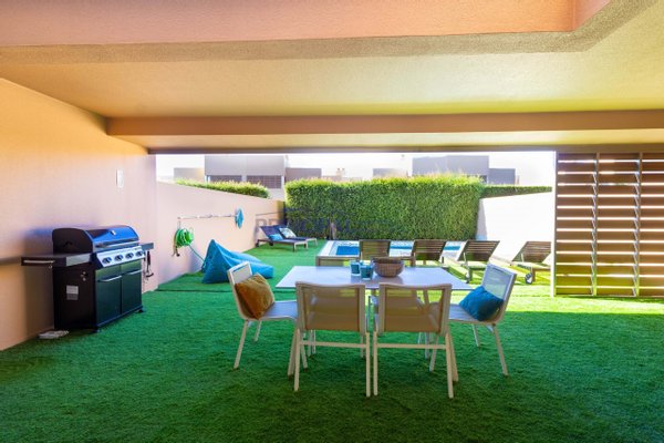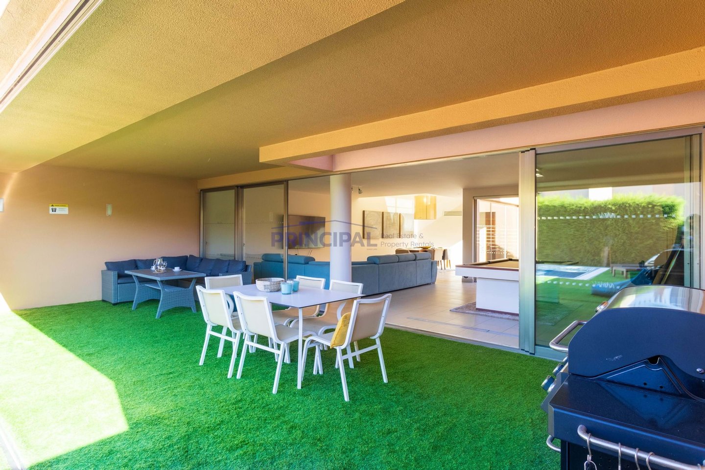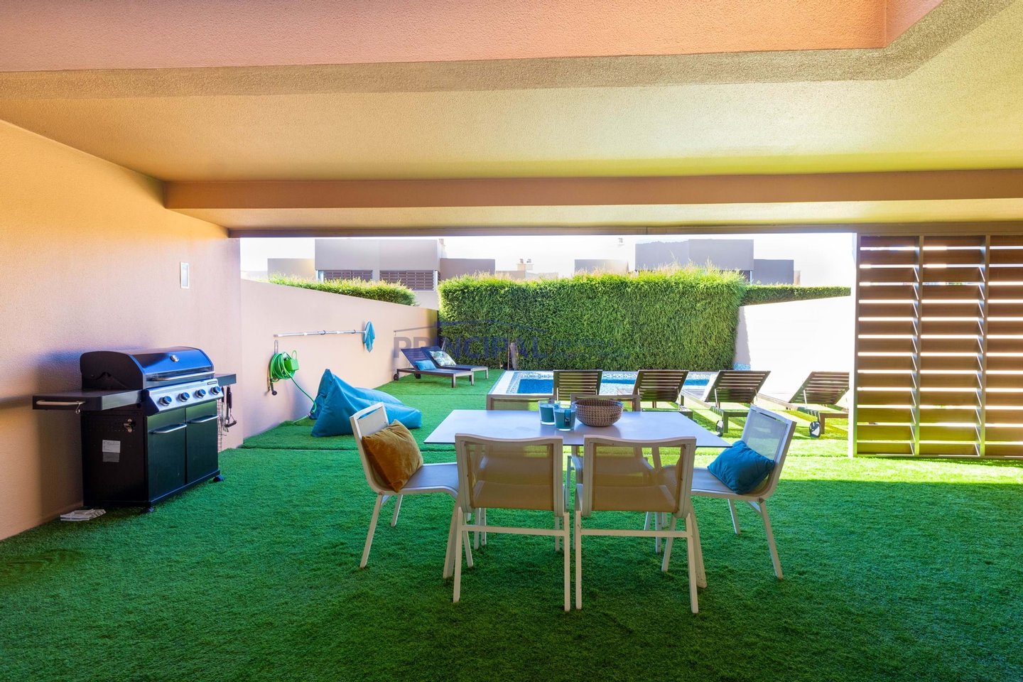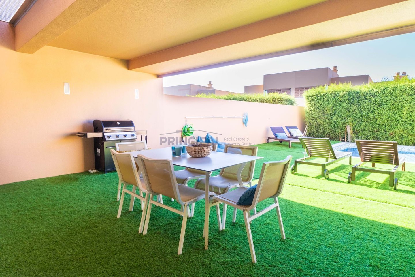 Draußen befindet sich der sonnengeschützte Essbereich und die Terrasse mit Holzböden im Terrassenstil rund um den Pool und Platz für Sonnenliegen.