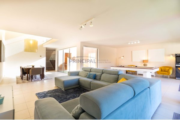 Auf dieser Etage befindet sich die Eingangshalle, mit Treppe zur Garage sowie zum Obergeschoss, die ausgestattete Küche, ein Servicebad, das riesige Wohn- und Esszimmer mit hohen Decken, umgeben von großzügigen Fenstern und Tageslicht, mit direktem Zugang zum Poolbereich.