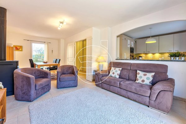 Mit einer Wohnfläche von 85 m² besteht es im Erdgeschoss aus einem großzügigen Wohnzimmer/Esszimmer, einer halb offenen, ausgestatteten Küche und einem direkten Zugang zum Garten mit einer Terrasse von ca. 15 m² sowie einem Gäste-WC.