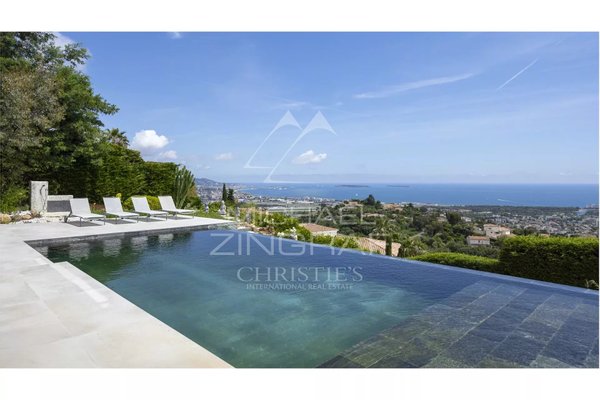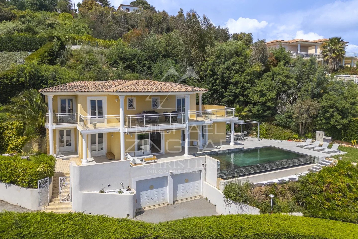 Der Meerblick ist spektakulär und das Panorama reicht von der Bucht von Cannes mit den Lérins-Inseln bis zur Bucht von Théoule, die den Beginn des Esterel-Gebirges markiert. 5 Minuten vom Stadtzentrum, 10 Minuten von den Stränden und Restaurants des Hafens von La Napoule, 10 Minuten vom Golfplatz von Mandelieu, 20 Minuten von La Croisette und 30 Minuten vom Flughafen Nizza entfernt.