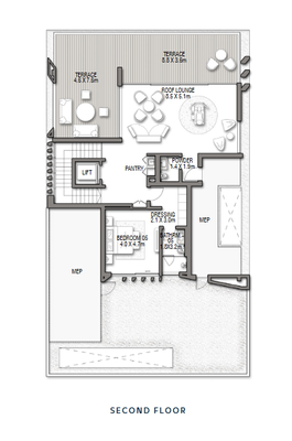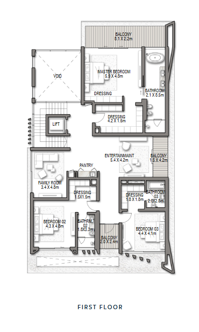 Im ersten Stock erwarten Sie drei Schlafzimmer, jedes mit eigenem Bad und Ankleidezimmer. Drei Balkone bieten Ihnen einen schönen Ausblick. Ein großer Familienraum, ein Unterhaltungsbereich und eine Pantry vervollständigen diesen Bereich.