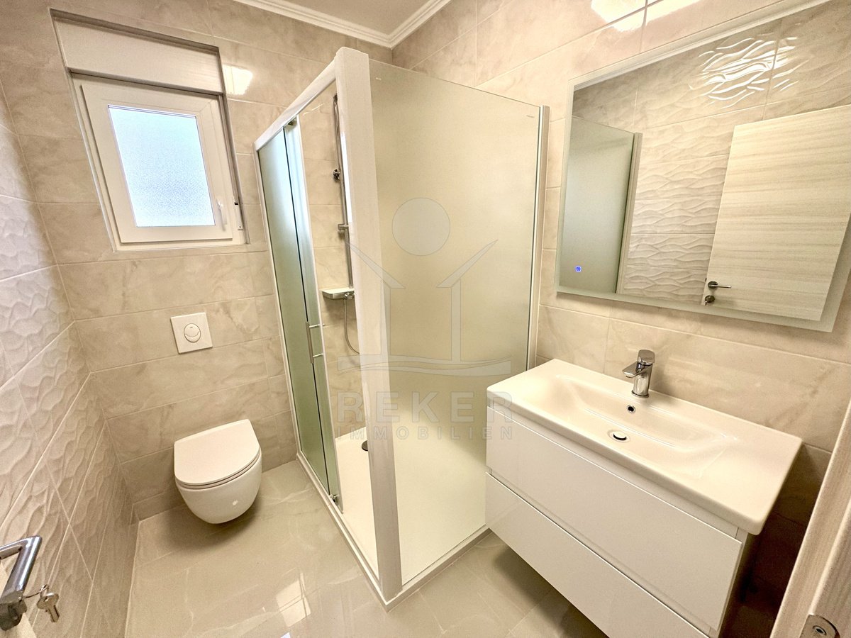 Diese luxuriöse Neubauwohnung im 1. Stock besticht durch einen großzügigen Grundriss mit 4 Zimmern, der Ihnen und Ihrer Familie viel Platz zur Entfaltung bietet. Der weitläufige Balkon mit wunderschönem Meerblick ist der ideale Ort, um den Sonnenuntergang über der Adria zu genießen oder einfach nur die salzige Meeresbrise zu verspüren.