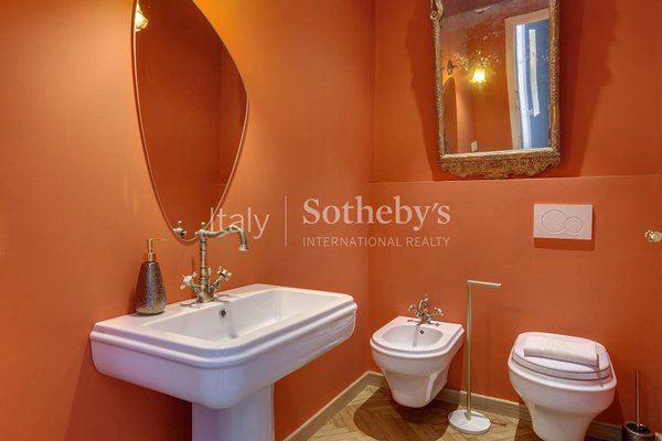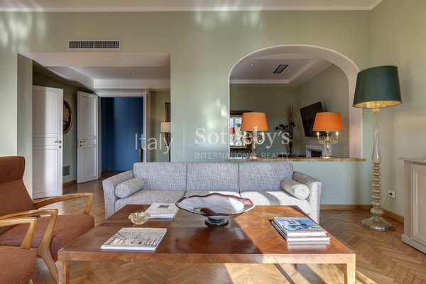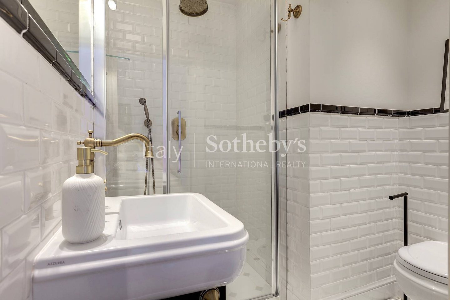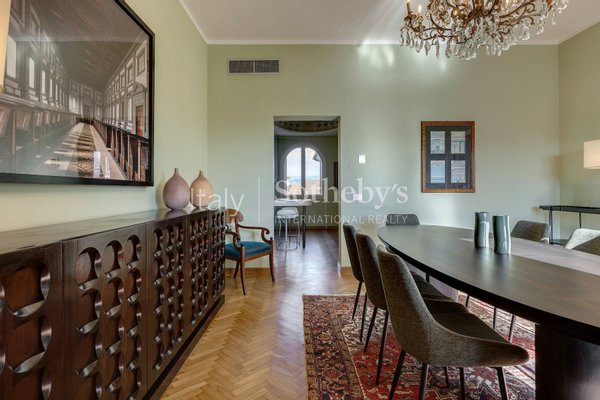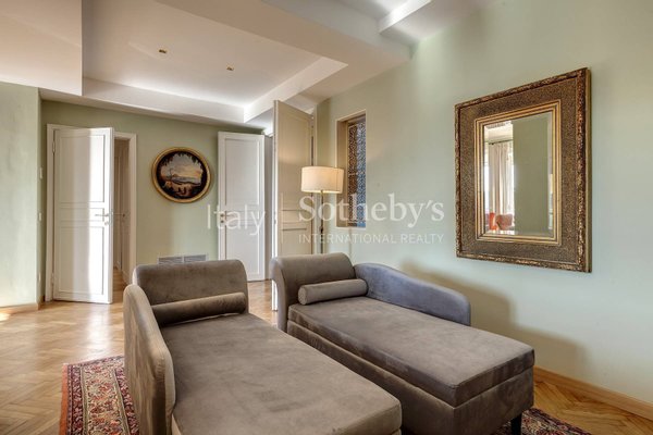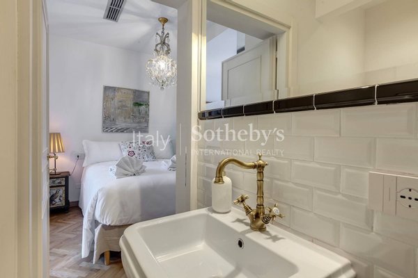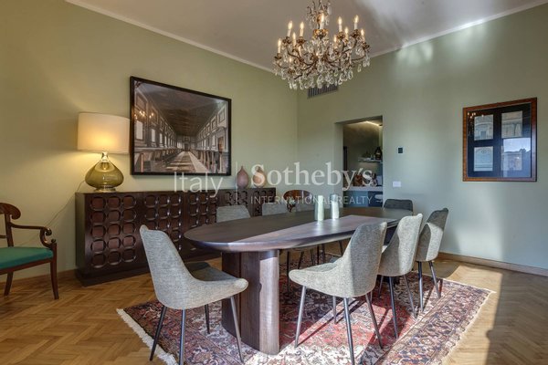 The spacious, bright, and welcoming living room is furnished with sofas and armchairs, perfect for relaxing in front of the TV after a day spent exploring the city. Adjacent to the living room, the dining room is ideal for convivial and memorable dinners, while the balconies offer a charming view of the Arno River and Florence's most famous bridges.