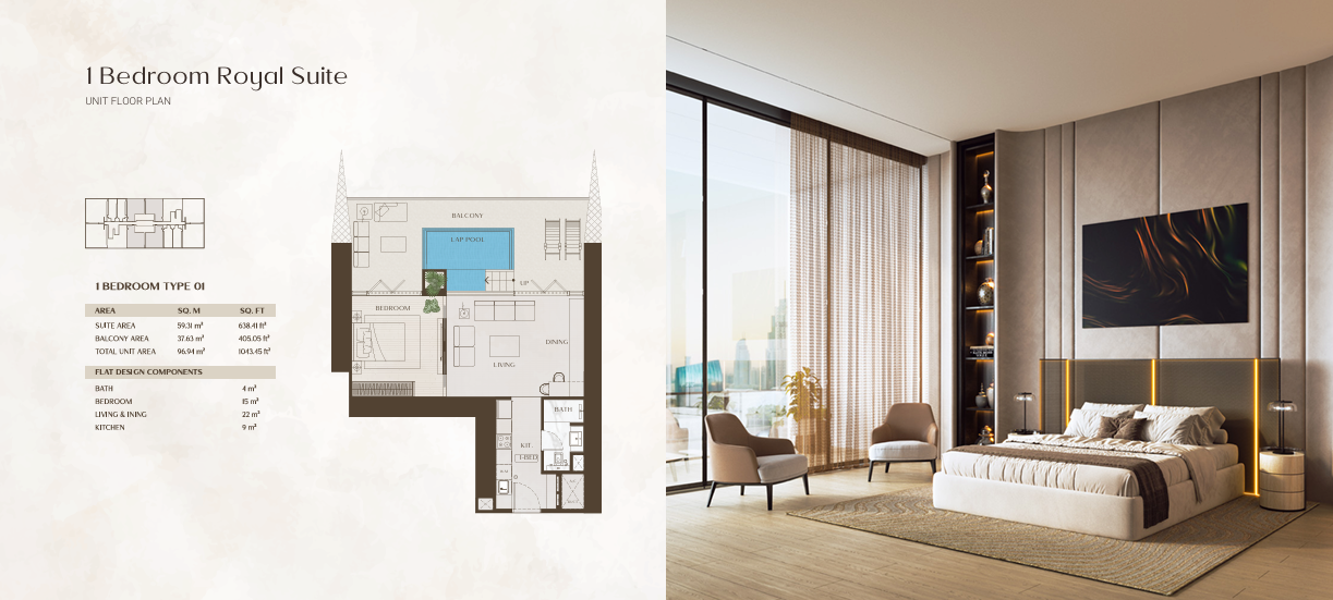 Willkommen in dieser exklusiven 1-Zimmer-Suite mit Pool, die sich perfekt für Singles und Investoren eignet. Betreten Sie das Gebäude durch die elegant gestaltete Empfangshalle und den Liftlobby, die einen Hauch von Luxus und Raffinesse vermitteln.