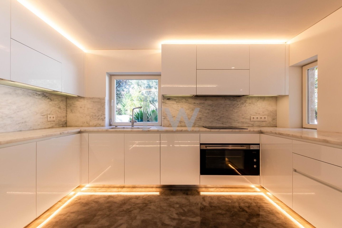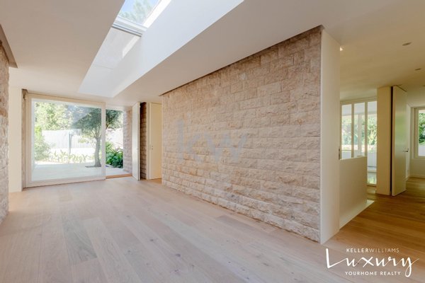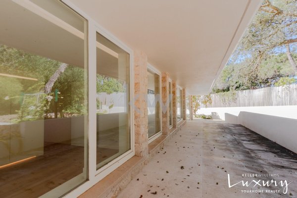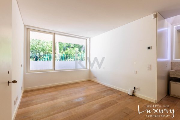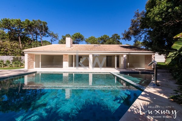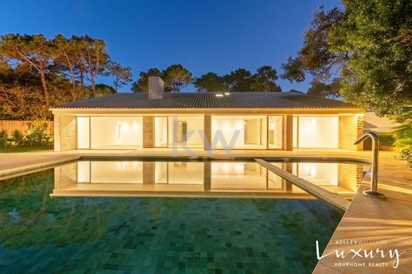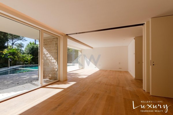 Für ein raffiniertes Wohnerlebnis werden wir beim Betreten von einem imposanten Atrium (50 m²) mit einem Oberlicht begrüßt, das das natürliche Licht verstärkt. Das große Wohnzimmer (58m²) ist in Wohn- und Essbereich unterteilt, getrennt durch einen eleganten Kamin mit Kaminofen, und bietet durch großzügige Fenster einen atemberaubenden Blick auf den Garten und den Pool. Die 38 m² große italienische Designküche (SCIC) ist komplett mit hochwertigen deutschen Markengeräten ausgestattet, die die zentrale Insel aus Estremoz-Marmor hervorheben. Die Hauptsuite (65 m²) ist ein wahres Refugium mit Schlaf- und Bürobereichen, die durch abnehmbare Paneele getrennt sind, sowie einem Kleiderschrank und einem luxuriösen Badezimmer. Ergänzt wird der Raum durch zwei weitere Schlafzimmer (16m² und 18m²) und eine zweite Suite (21m²), die alle mit Einbauschränken ausgestattet sind.