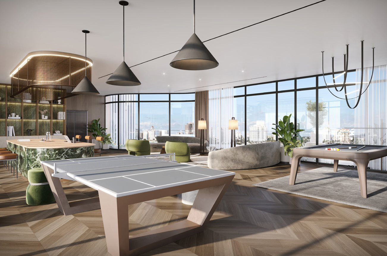 Die Küchen verfügen über Bosch-Geräte, elegante Schränke und hochwertige Arbeitsplatten, während die Badezimmer mit schlanken Kohler-Armaturen verziert sind. Genießen Sie einen luxuriösen Lebensstil mit einem Resortpool, einer Poolbar, einem Lazy River, einem Kinderpool und einem Splash-Park, die entworfen wurden, um Entspannung und Freizeit zu erhöhen.