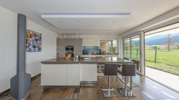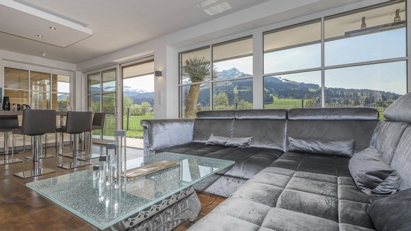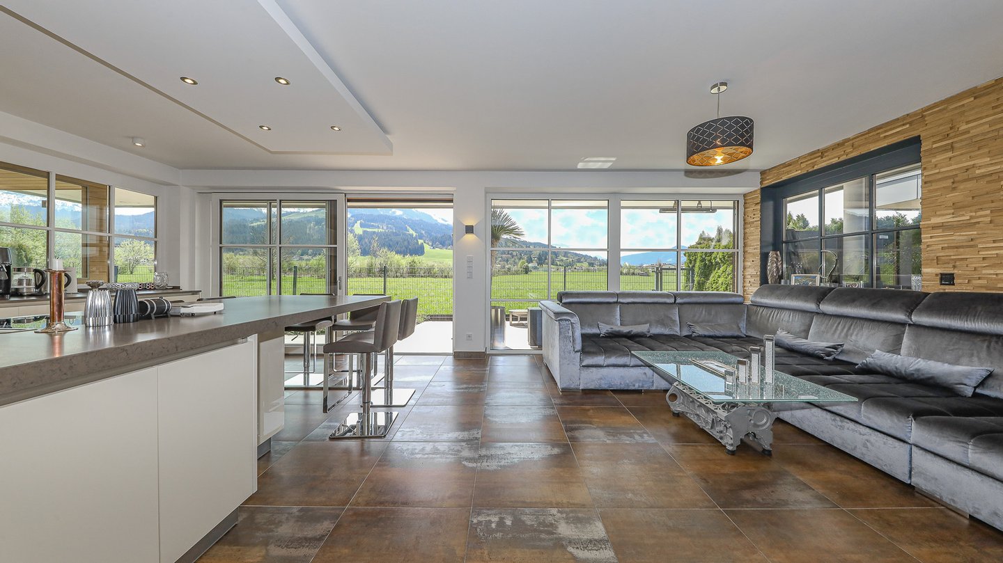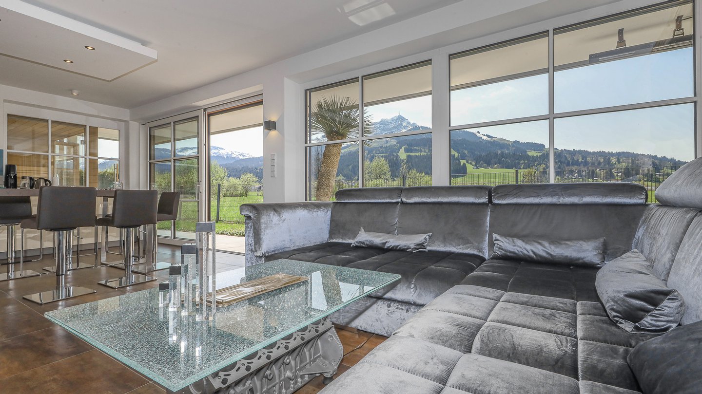 Durch die großen Glasfenster bietet sich ein traumhafter Ausblick ins Grüne und auf die Kitzbüheler Alpen.
