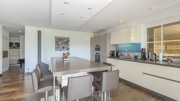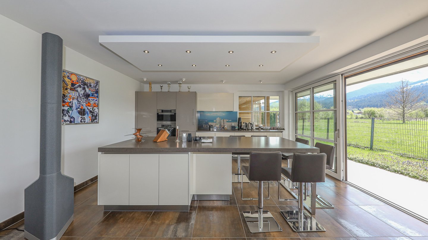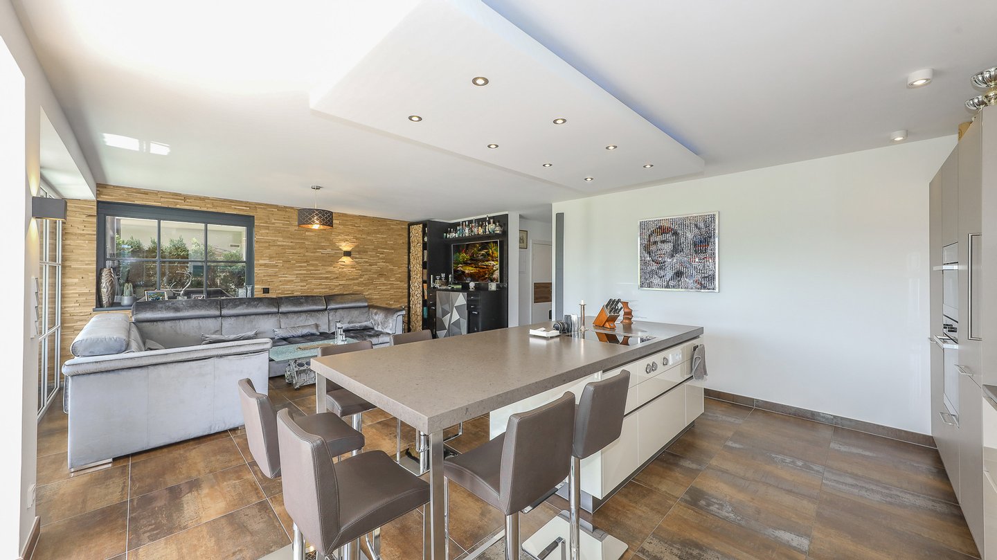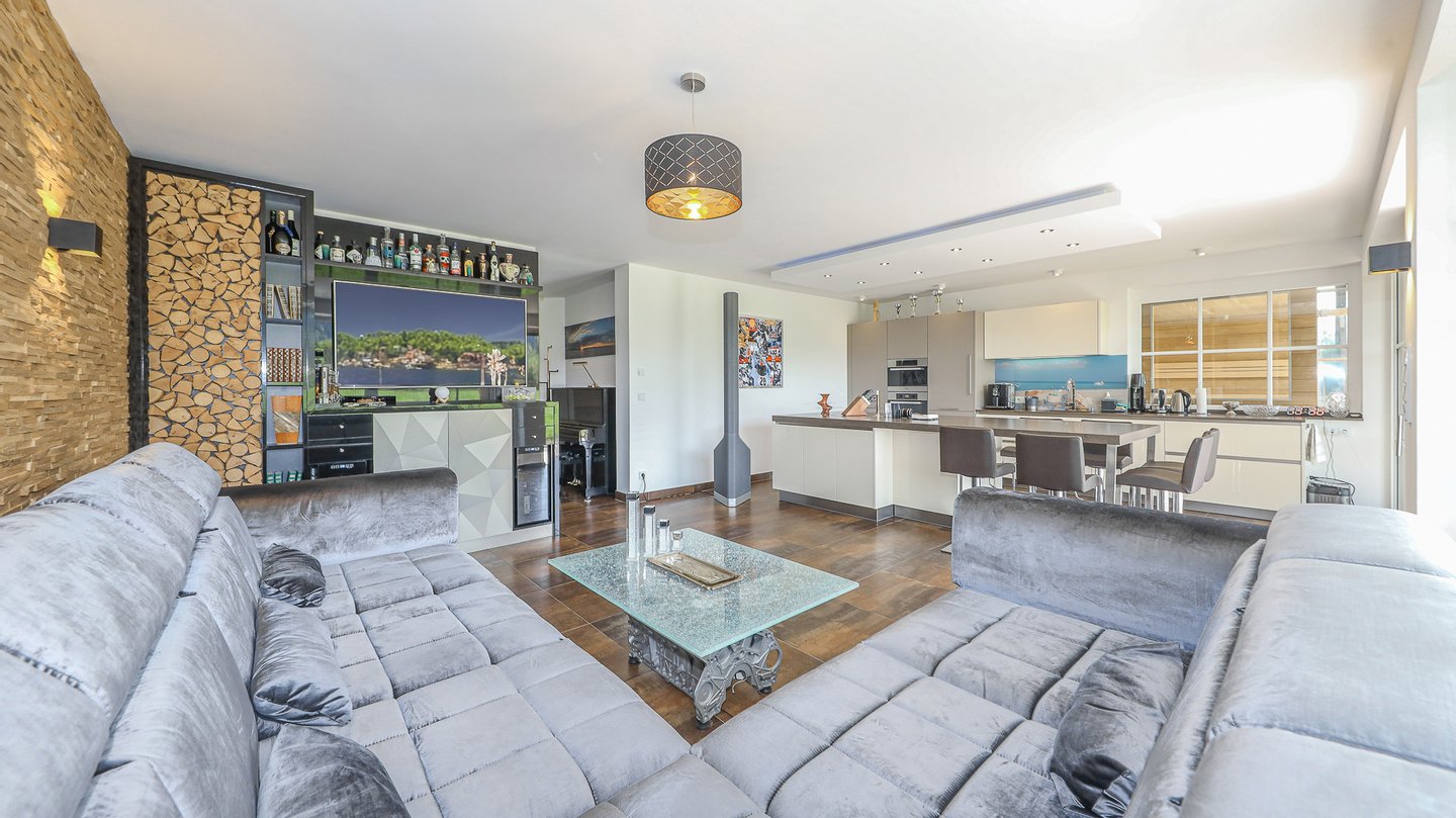 Sodann betritt man das große Wohn/Esszimmer mit einer hochwertigen Designerküche, welche mit allen Geräten ausgestattet ist.