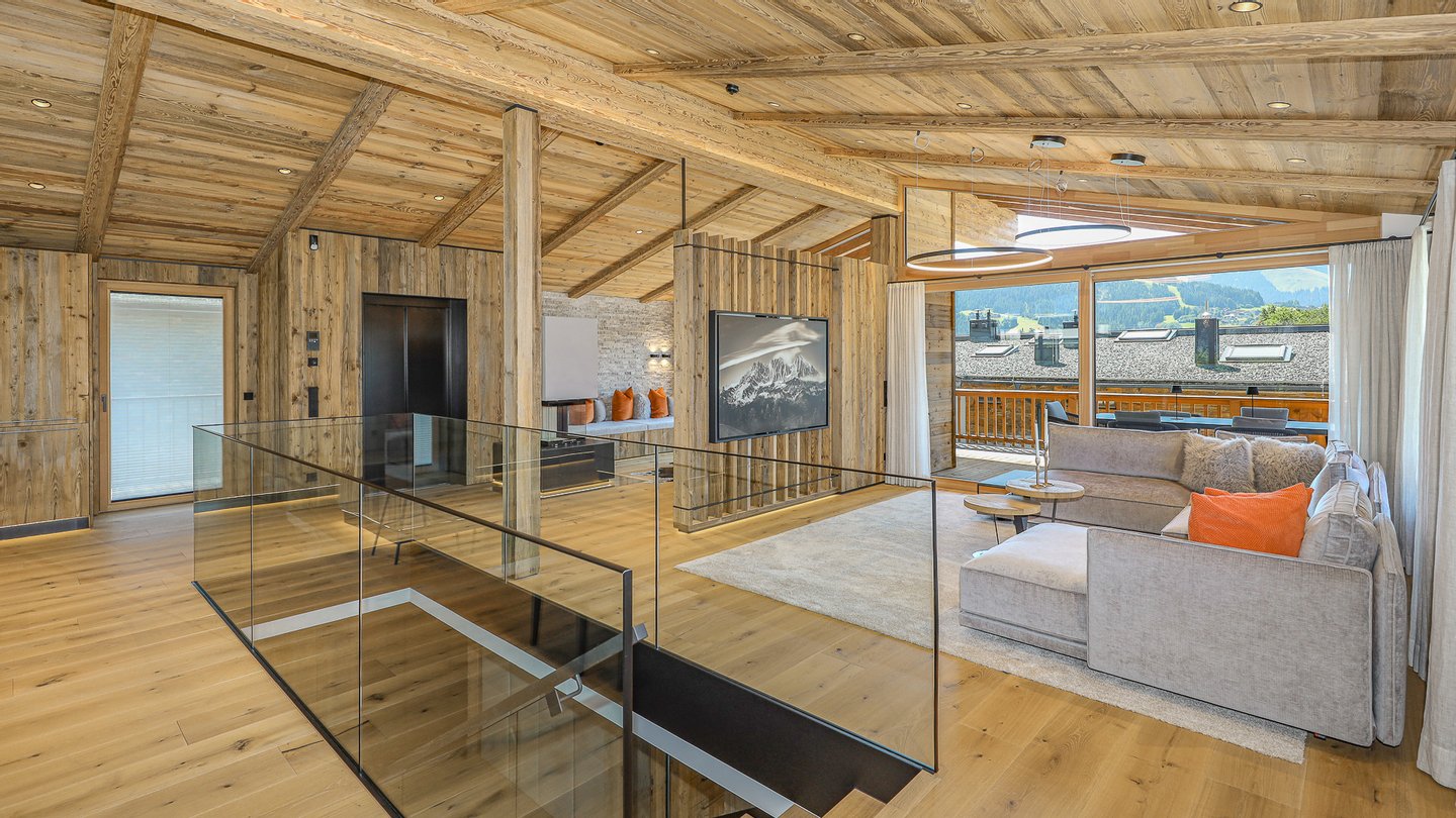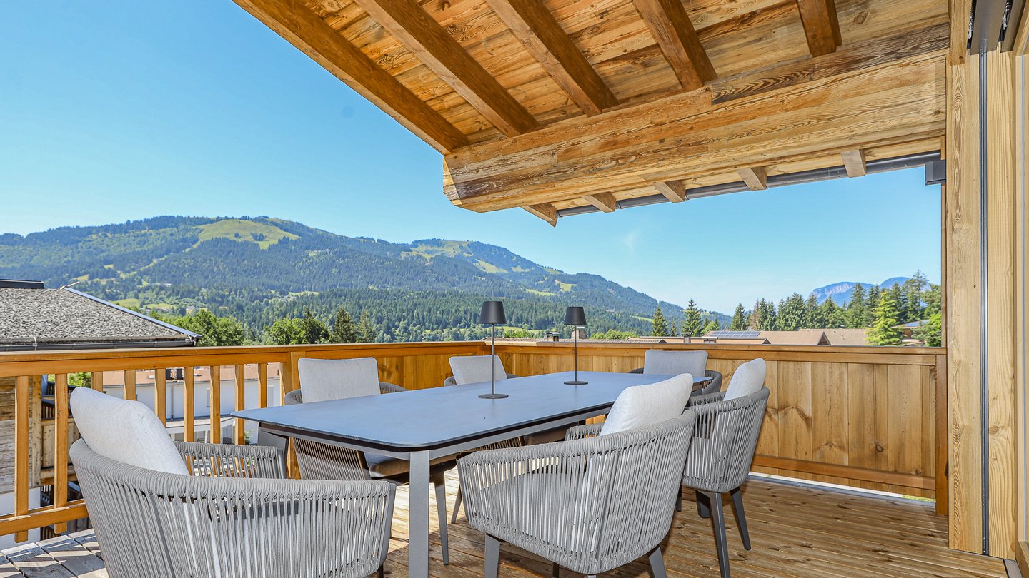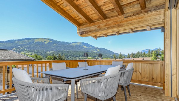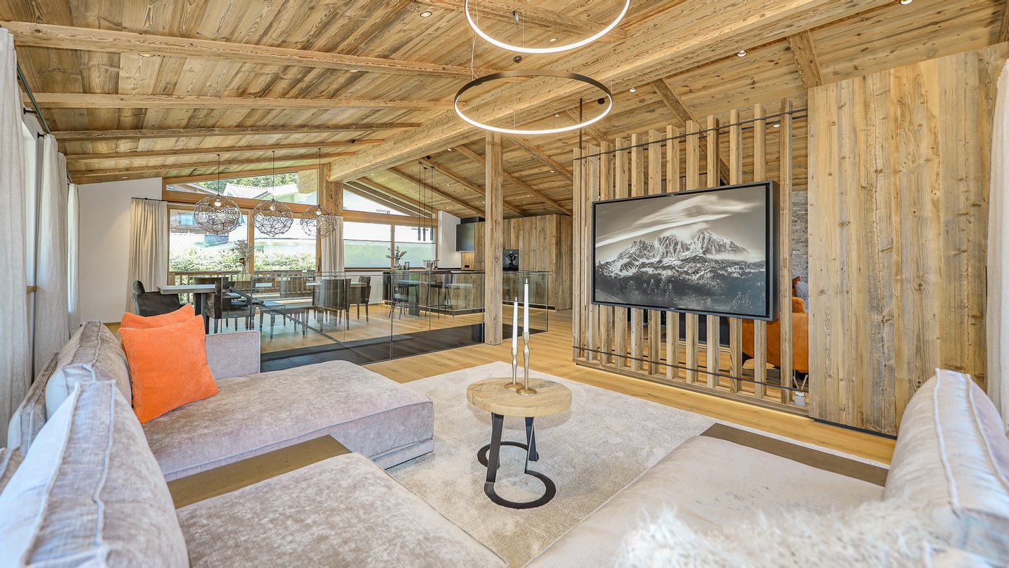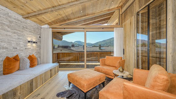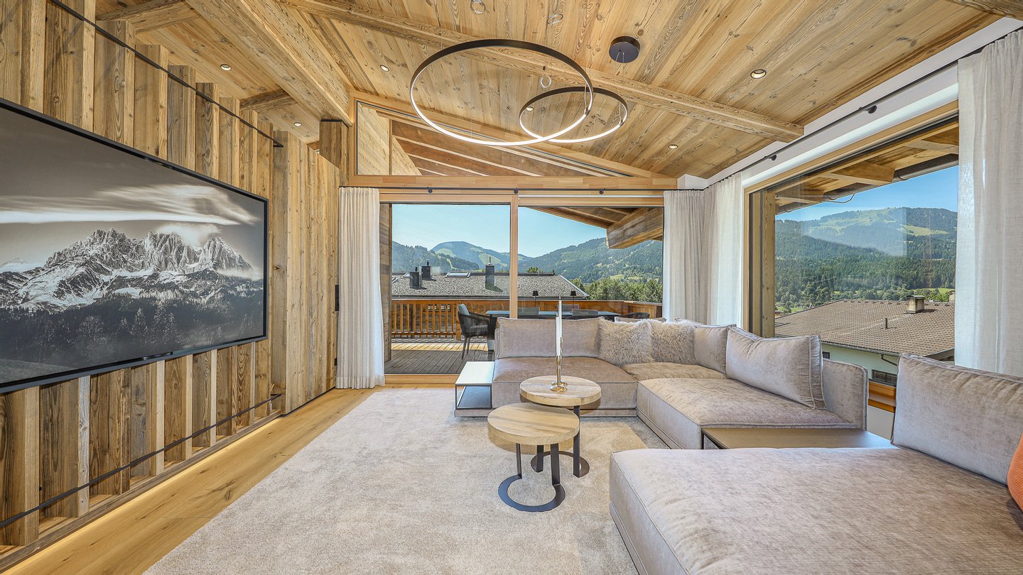 Der gemütliche Wohnbereich mit offenem Kamin und Ausgang auf die Richtung Süden ausgerichtete Terrasse, laden ein, es sich hier gemütlich zu machen. Die zwei Terrassen bieten einen wunderschönen Ausblick auf das Kitzbüheler Horn sowie den Wilden Kaiser.