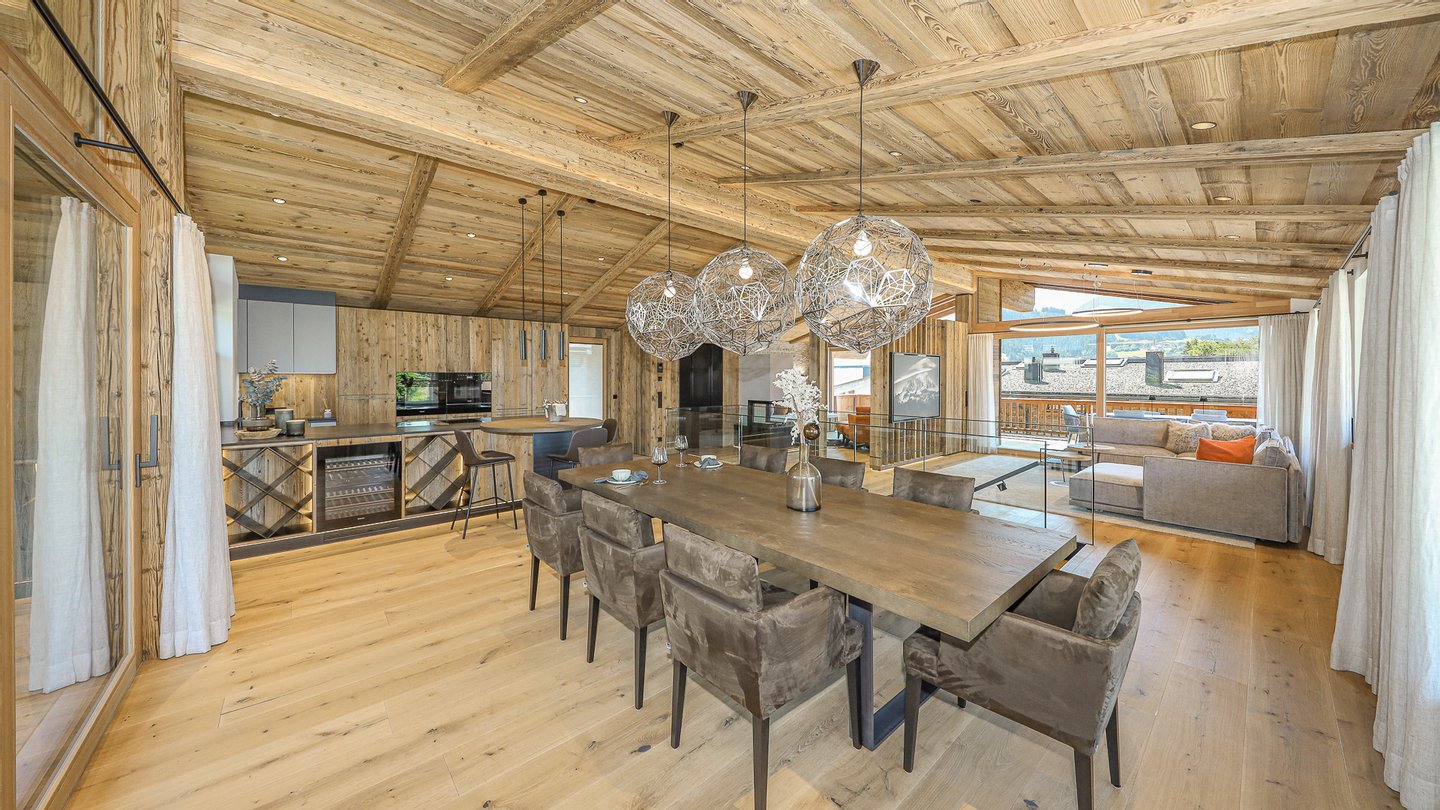 Hier befindet sich auch die offene Küche, welche mit hochwertigsten Geräten überkomplett ausgestattet ist sowie der angrenzende Essbereich mit Platz für bis zu 10 Personen.