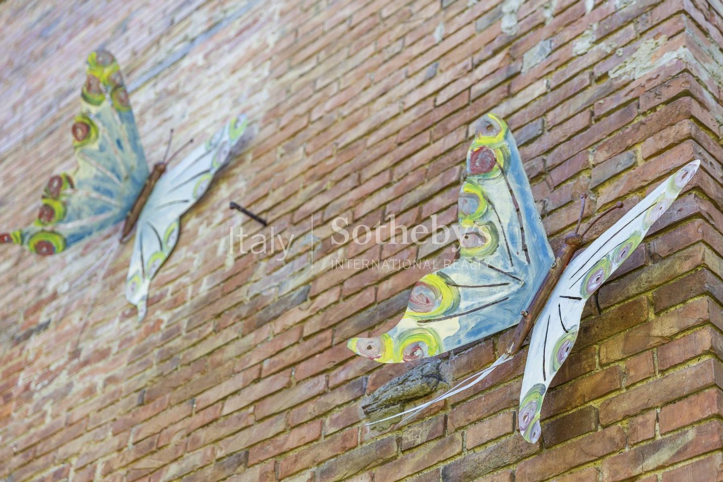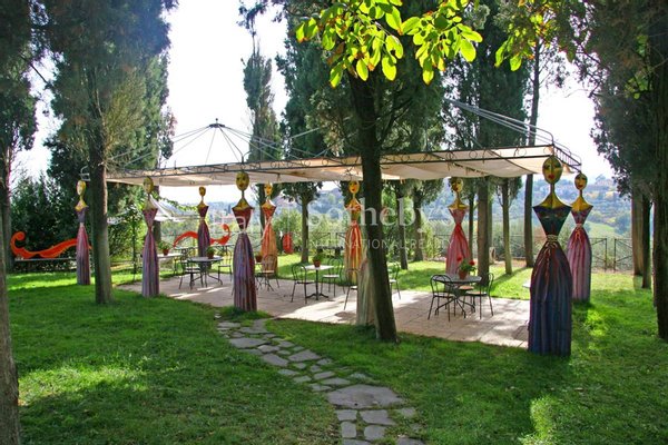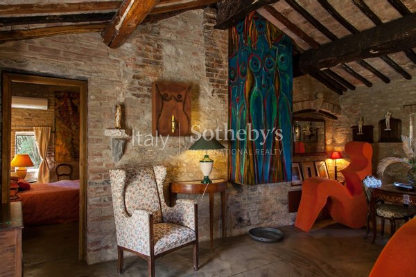 In diesem Anwesen hat die Künstlerin viel von sich selbst hinterlassen. Schon beim Betreten des Gartens hat man das Gefühl, in ein Freilichtmuseum einzutreten. Hohe Metallskulpturen, die weibliche Körper darstellen, begleiten den Besucher zum Eingang. Sitzgelegenheiten mit Schmetterlingsflügeln und leuchtenden Farben prägen die einzigartige Atmosphäre der Wiese vor dem Anwesen mit Blick auf Torrita. Derzeit ist die Immobilie in vier Einheiten unterteilt und bietet insgesamt 11 Schlafzimmer, die früher als Künstlerresidenz vermietet wurden. Im großen Wohnraum ist der Boden von der Künstlerin selbst bemalt; Tische, Stühle - jedes Element spricht von ihr und ihrer Geschichte. Jedes Stück wurde von ihr entworfen und positioniert, um dieses Anwesen einzigartig zu machen.