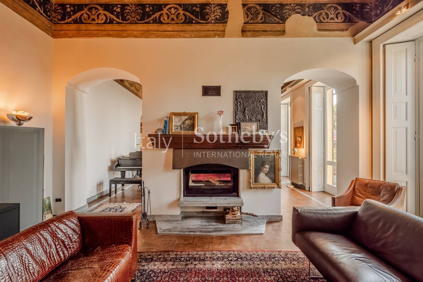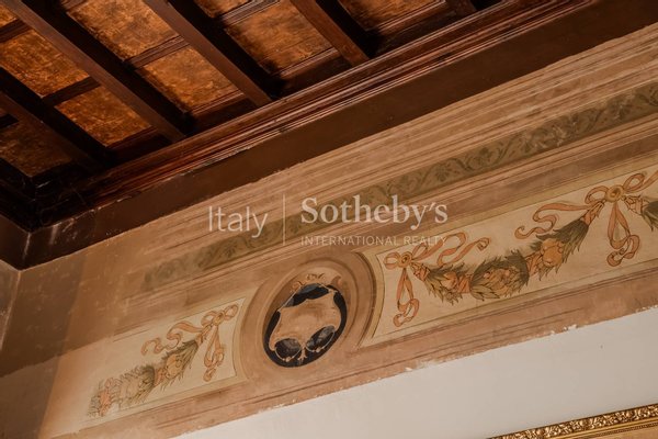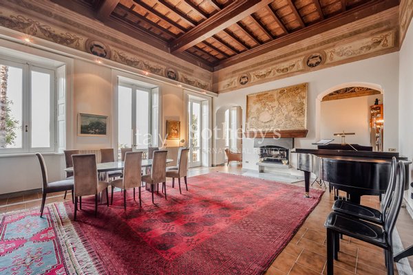 Located within a historic 19th-century villa, this residence was originally a hermitage dating back to the 14th century. The interiors feature exquisite period details, such as finely preserved frescoes and exposed wood-beamed ceilings, which add warmth and character to the rooms. The spacious and bright living area is enhanced by a magnificent decorative fireplace. The large windows overlooking the lake capture the surrounding natural beauty, providing extraordinary light and breathtaking views.