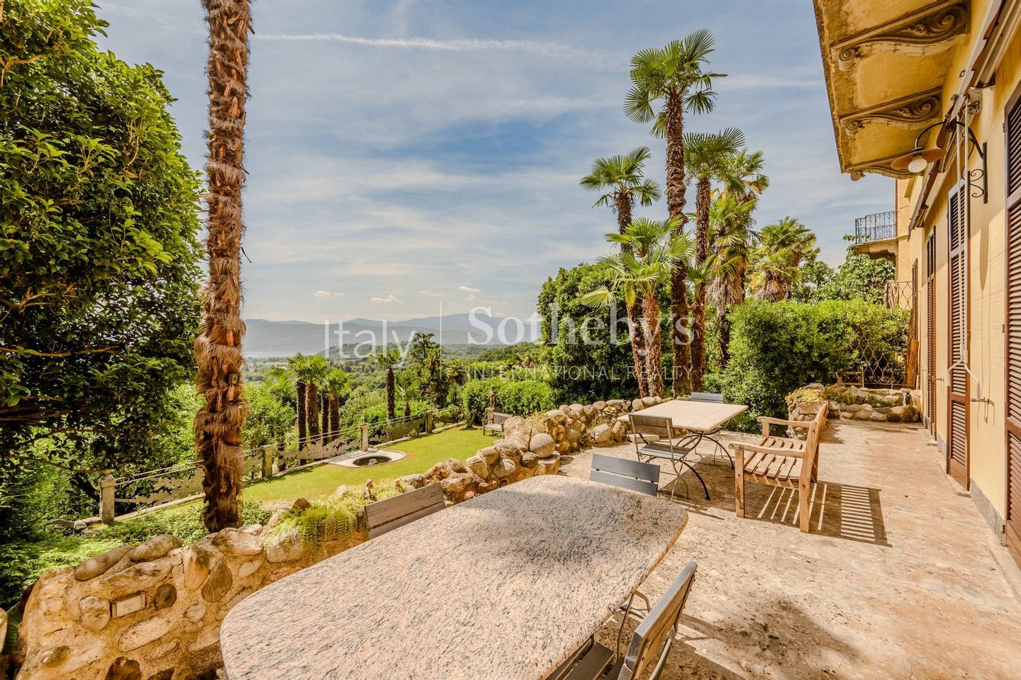 The property is surrounded by a lush Italian-style terraced garden, offering the opportunity to stroll among centuries-old trees and palms, all in a private and evocative setting.