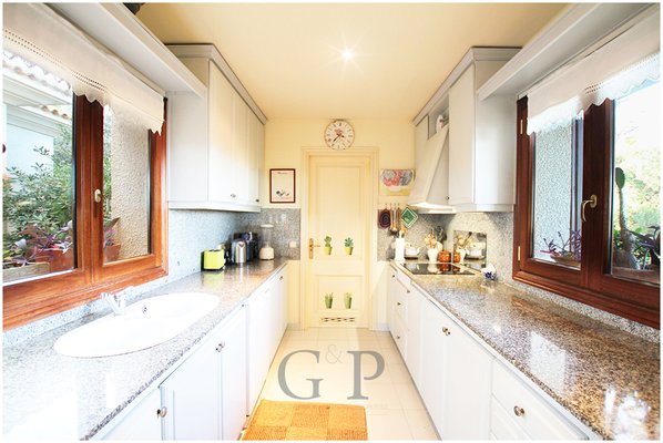 Von Wohn- und Esszimmer, als auch von der Küche, haben Sie Zugang auf die wunderschönen, teilweise überdachten, Terrassen und zum Poolbereich. Der Ausblick und das Ambiente ist fantastisch und lädt zum entspannten Verweilen ein.