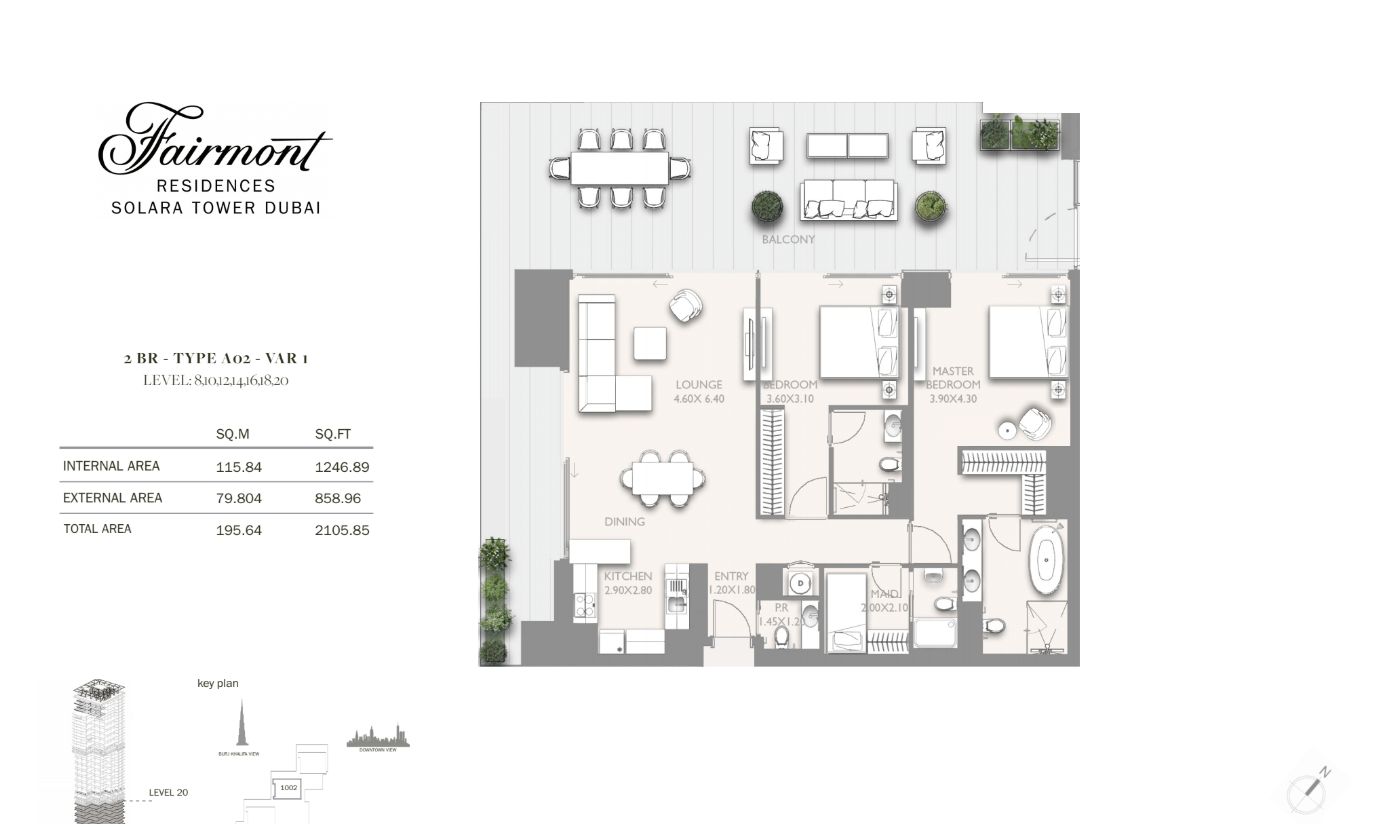Treten Sie ein in die Fairmont Residences Solara Tower und lassen Sie sich von einem atemberaubenden Blick auf den Burj Khalifa, den Dubai Fountain und den Dubai Water Canal verzaubern. Hier erwartet Sie eine luxuriöse und komfortable Wohnumgebung, in der außergewöhnliches Design auf erstklassigen Service trifft.