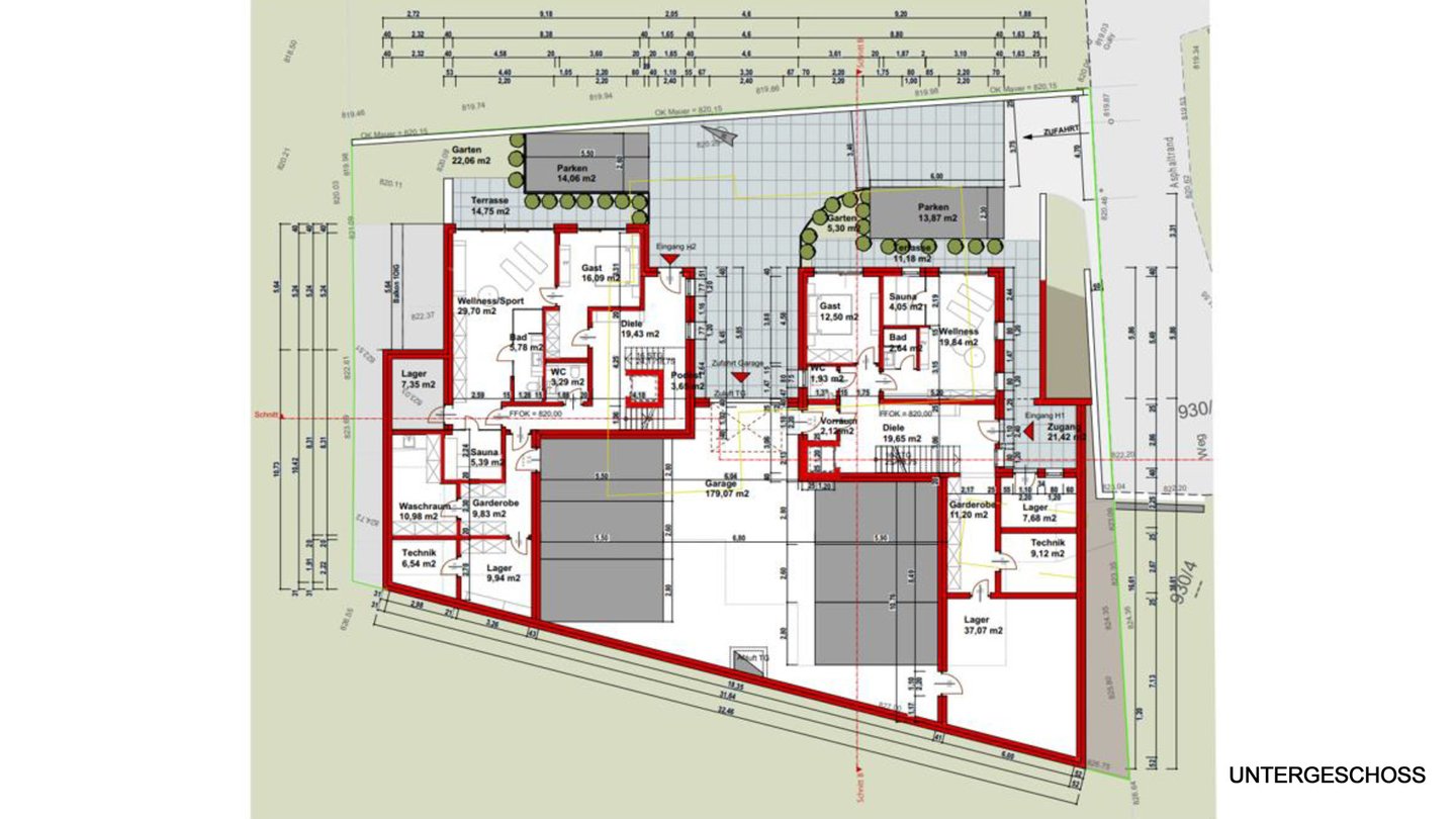 Beiden Villen stehen in der 179,07 m² großen Garage jeweils 3 Parkplätze zur Verfügung sowie ein Außenstellplatz pro Haus.