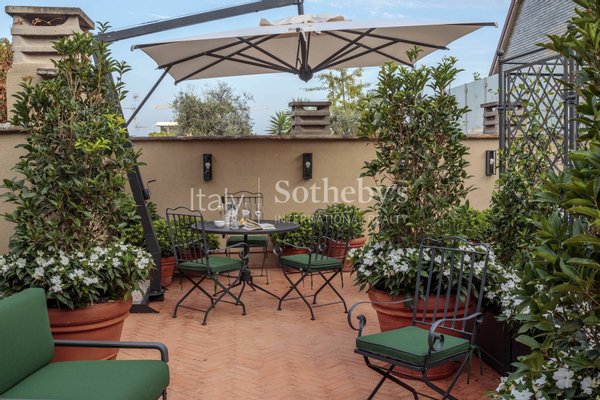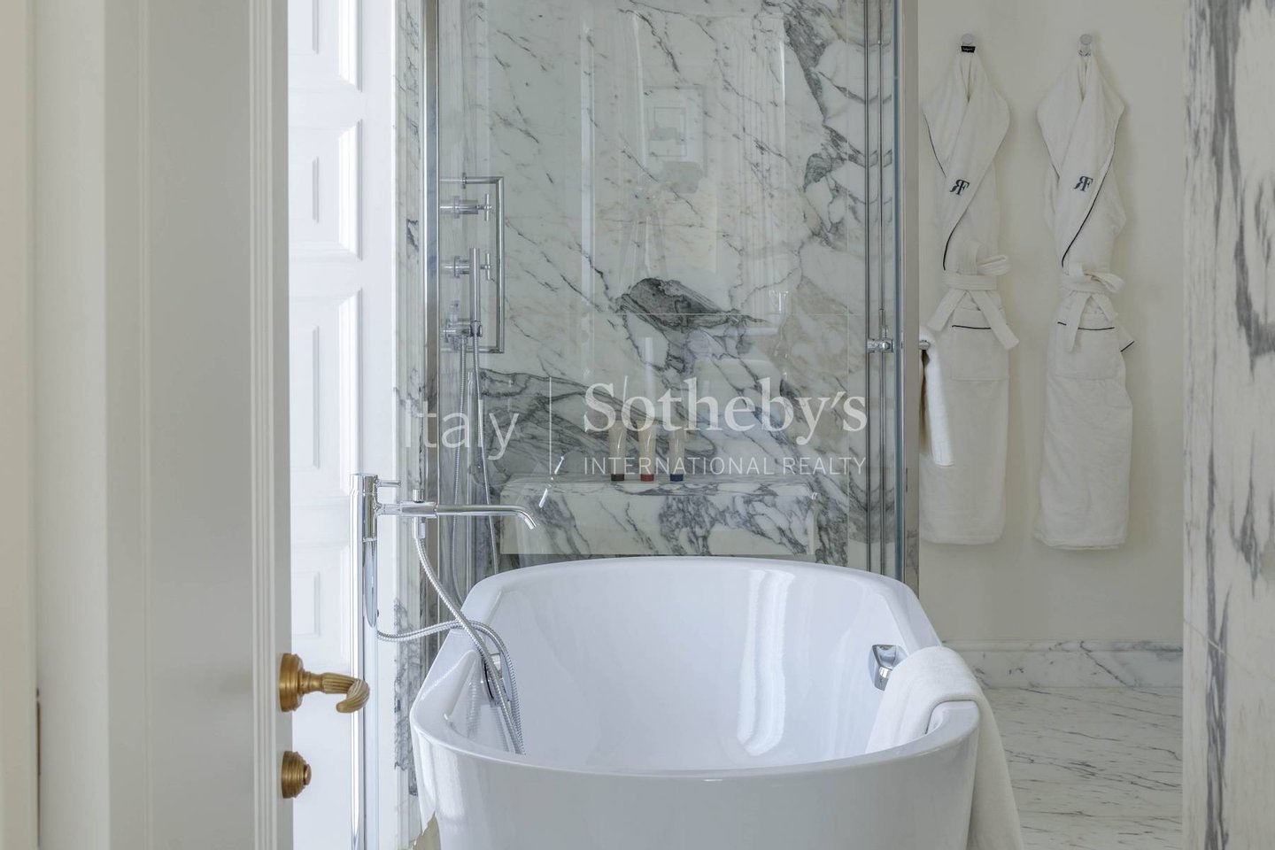Die großzügigen privaten Terrassen, die zwischen 35 und 68 Quadratmeter groß sind, bieten bezaubernde Ausblicke auf die Via Manzoni und die Via della Spiga und schaffen die perfekte Kulisse für Abendessen im Freien. Die Innenräume verfügen über ein Wohnzimmer mit komfortablen Sofas und einen Essbereich, der an eine voll ausgestattete Küche angrenzt - ideal, um Gäste stilvoll zu empfangen. Beide Schlafzimmer sind mit Kingsize-Betten und begehbaren Kleiderschränken ausgestattet, die höchsten Komfort garantieren. Das Hauptschlafzimmer verfügt zudem über ein eigenes Badezimmer mit Badewanne und Dusche, während das zweite Schlafzimmer von einem separaten Badezimmer mit Dusche profitiert und zusätzliche Privatsphäre bietet.