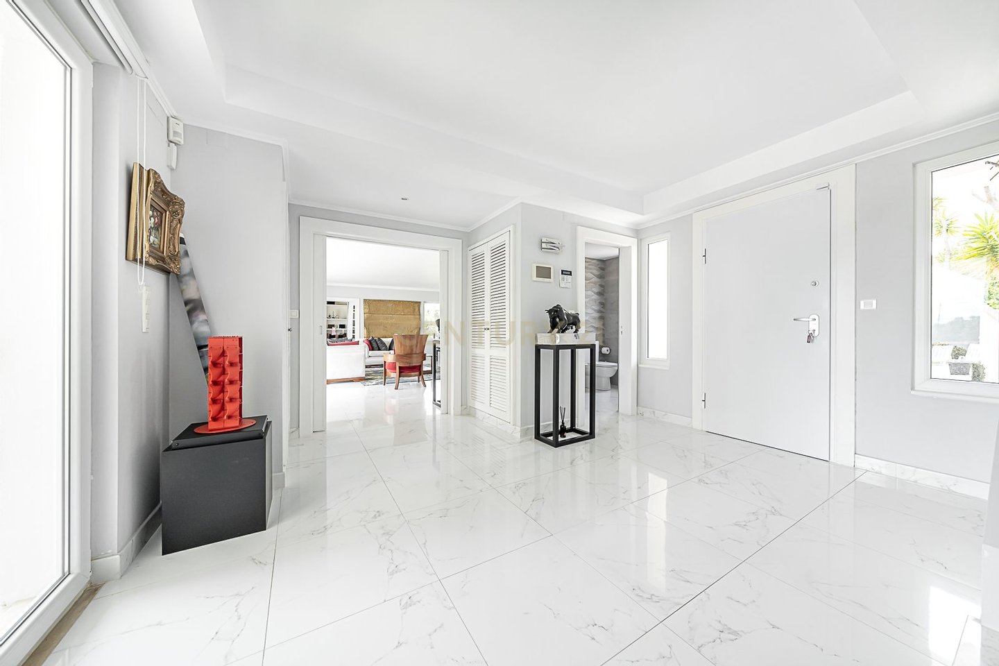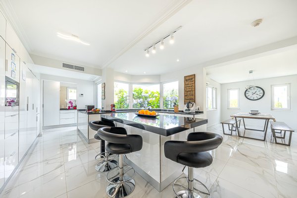 Im Erdgeschoss befinden sich eine großzügige Eingangshalle, ein großes Wohnzimmer mit Kamin, ein Esszimmer und ein Büro, alles mit direktem Zugang zum großen Garten und Schwimmbad.