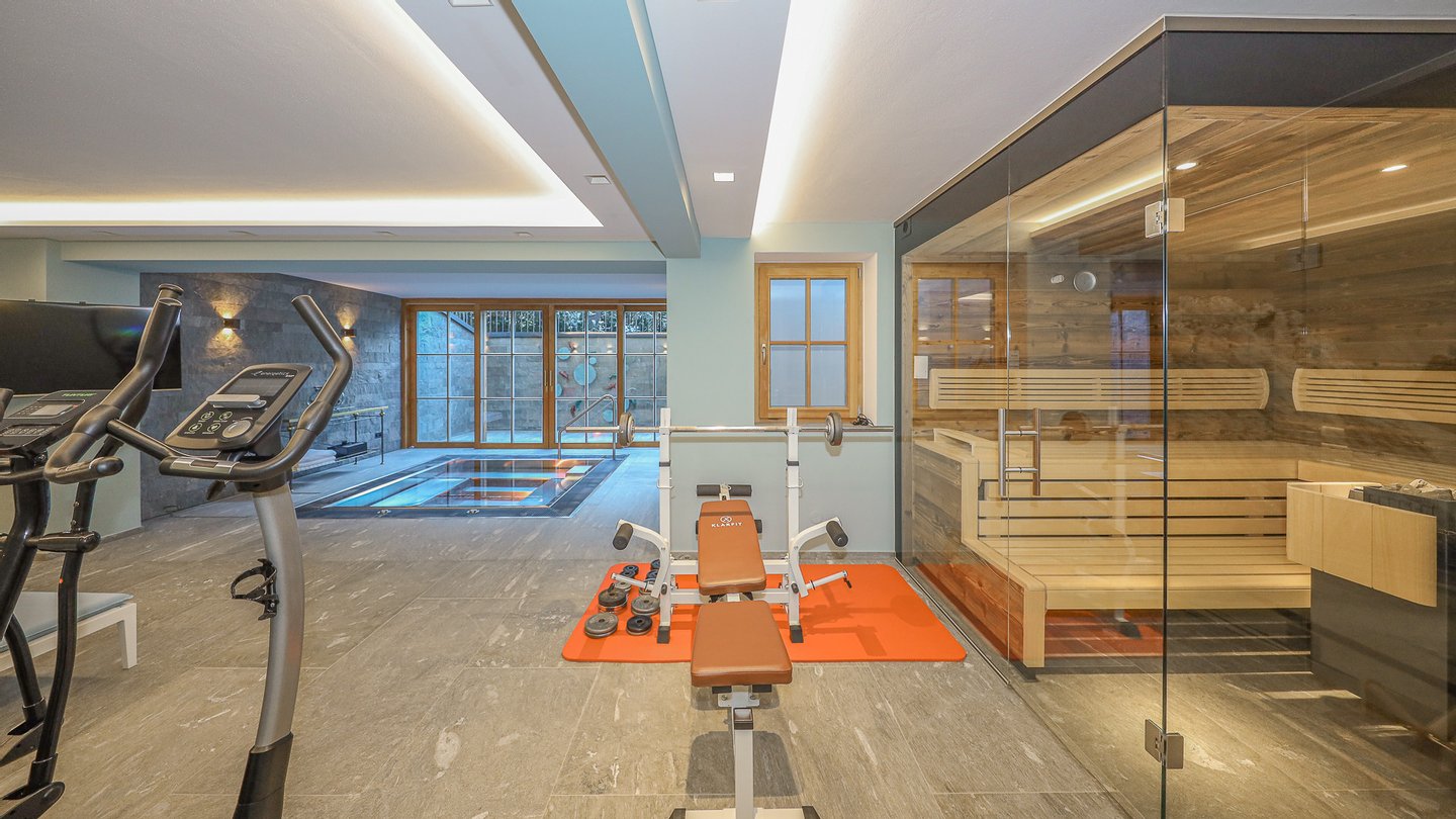 Zur Entspannung, steht im Untergeschoss der Hauses ein eigener Wellnessbereich mit Sauna, ein in den Boden eingelassener großer Whirlpool, Massageraum, Dusche und WC zur Verfügung.