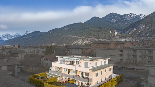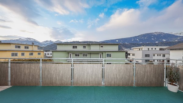 Der teilweise überdachte Balkon bietet nicht nur einen weitläufigen Ausblick auf die umliegende Bergwelt sondern bietet auch ausreichend Platz um es sich draußen gemütlich zu machen.
