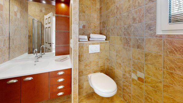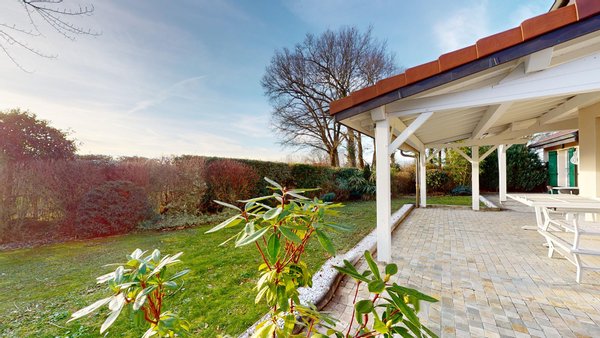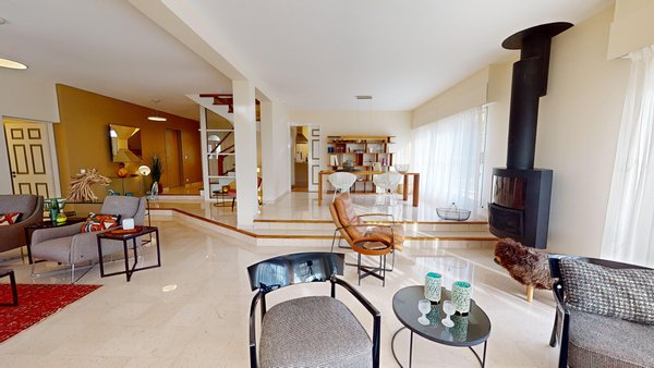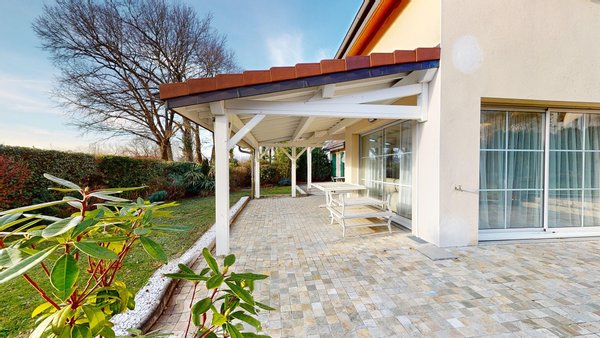 Im Außenbereich bietet eine geräumige, teilweise überdachte Terrasse einen idealen Entspannungsbereich, während der angelegte Garten mit automatischem Bewässerungssystem vom Hausmeister sorgfältig gepflegt wird. Eine motorisierte Doppelgarage mit Stauraum im Zwischengeschoss, die vom Haus aus zugänglich ist, vervollständigt diese Immobilie.
