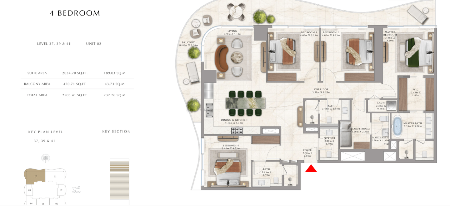 Luxuriöses 4-Schlafzimmer-Apartment mit riesigem Balkon und Zimmer für Bedienstete
