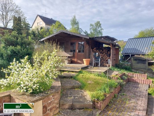 Zurück zum Eingangsbereich, von dort gelangen wir hinaus zur Terrasse, gehen über den Rasen, kommen zum Gartenhaus und erreichen den Garten mit einem angelegten Gartenteich.