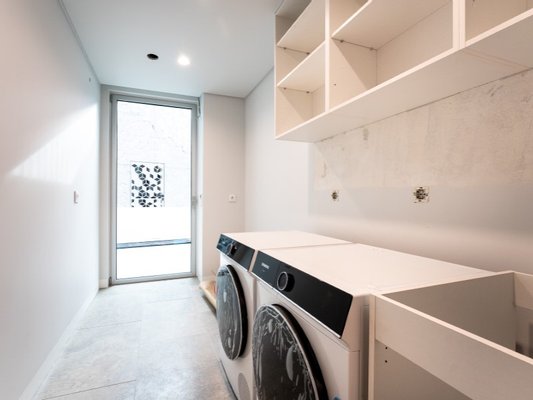 Waschküche mit Waschmaschinen und Trocknern von Siemens, die Praktikabilität und Effizienz bei den täglichen Aufgaben gewährleisten.
