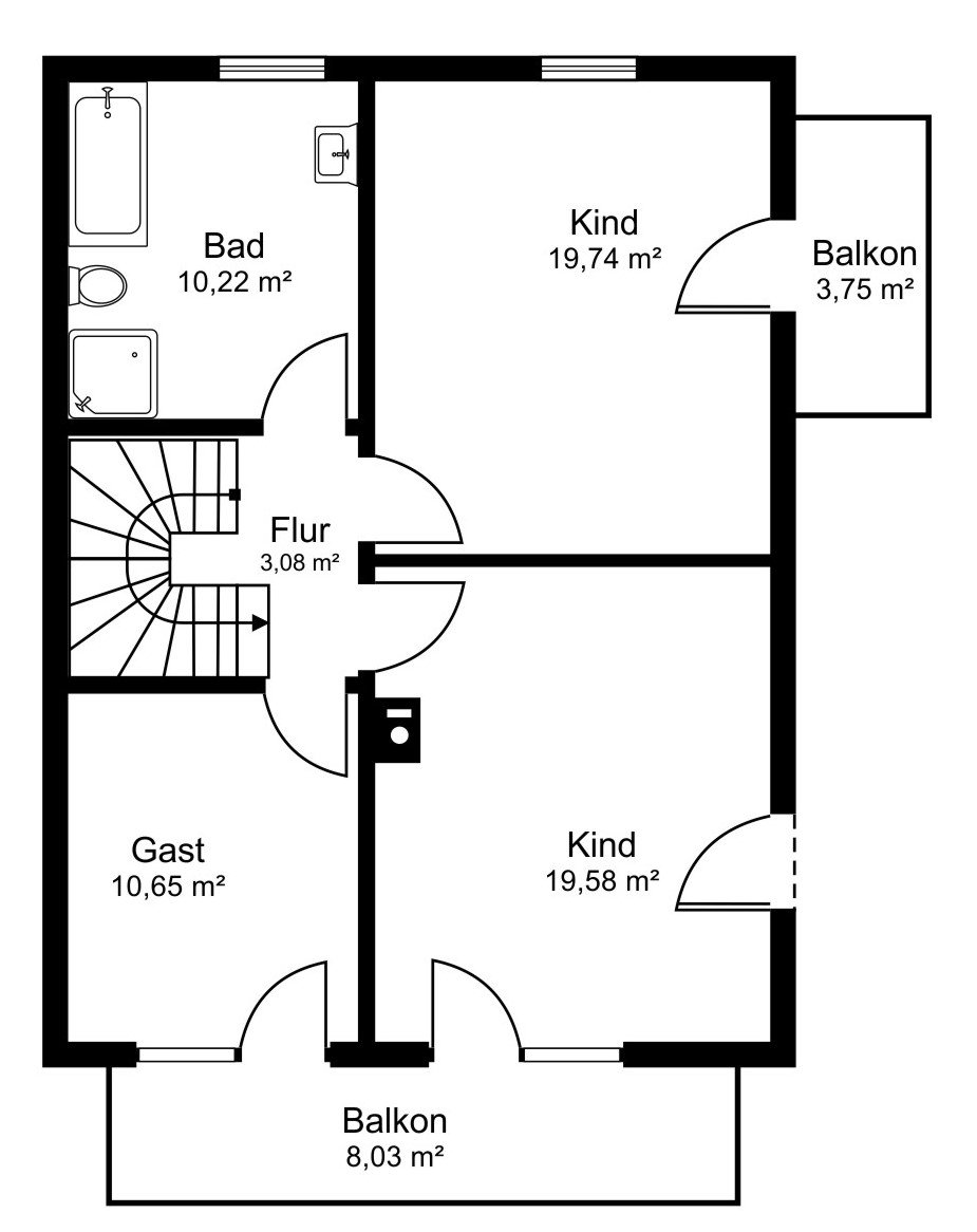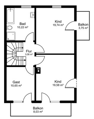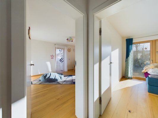 - Zwei Kinderzimmer (je ca. 19 m²), eines mit eigenem Balkon