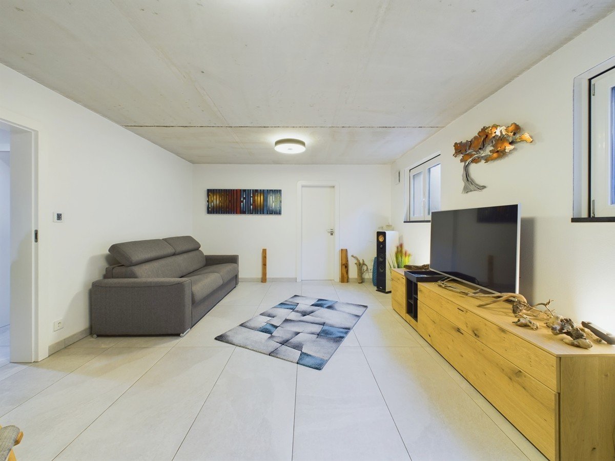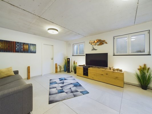 Das Untergeschoss bietet neben einem Technikraum und einem Abstellraum einen großen Hobbyraum mit viel Tageslicht und modernen Fliesen. Ein Arbeitszimmer und ein weiteres Badezimmer mit bodentiefer Dusche ergänzen das umfangreiche Raumangebot.