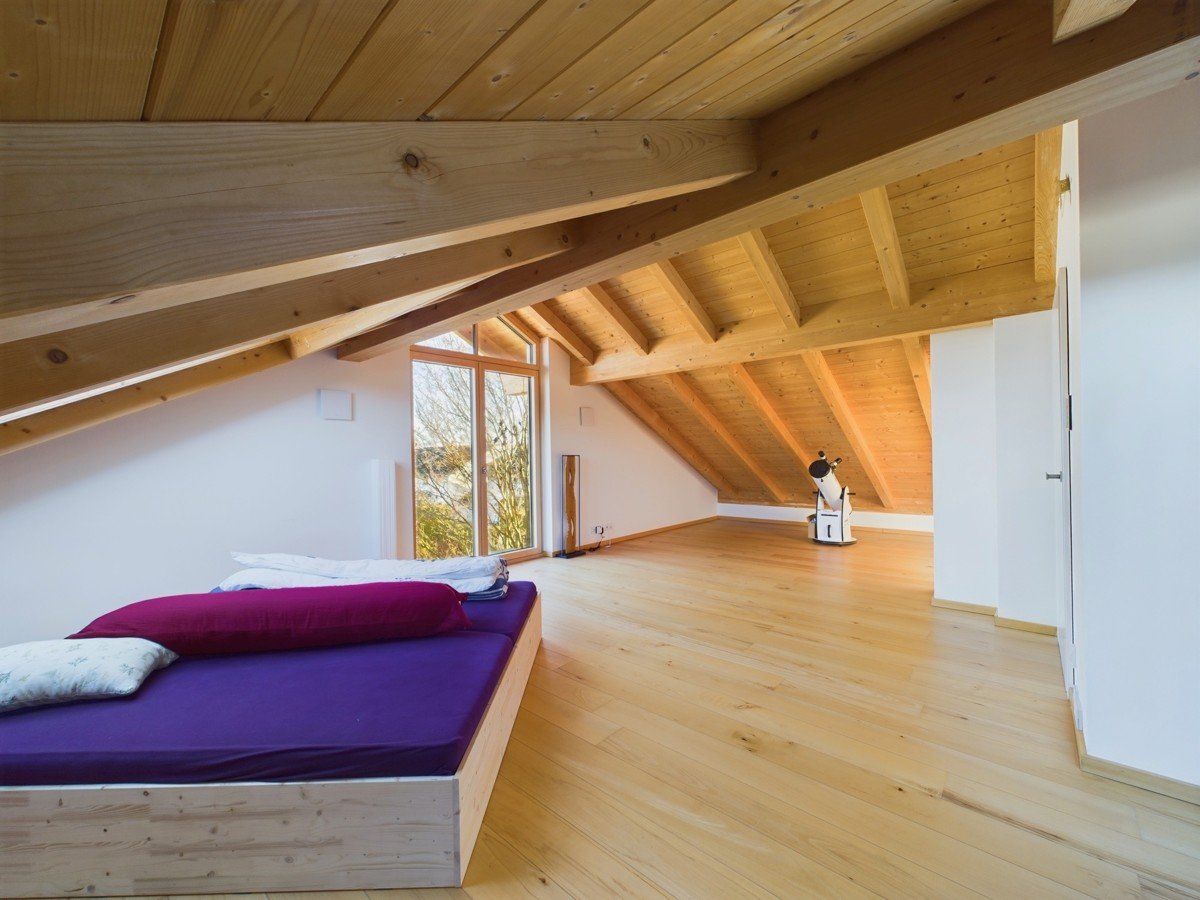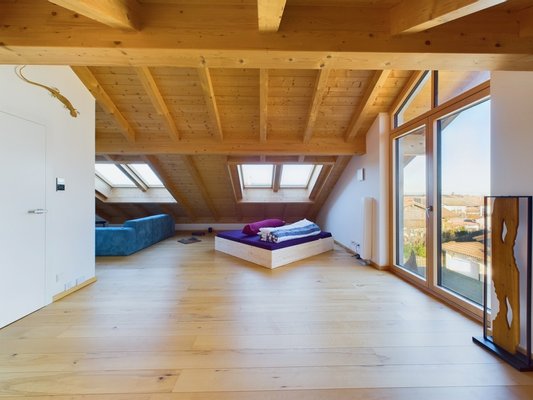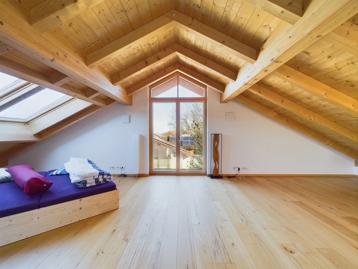 Das stilvolle Dachgeschoss ist vielseitig nutzbar, beispielsweise als Hauptschlafzimmer. Große Dachflächenfenster sorgen für viel Tageslicht, während die Holzverkleidung der Dachschrägen für Gemütlichkeit sorgt. Auch hier gibt es einen Balkon, der das Raumangebot abrundet.