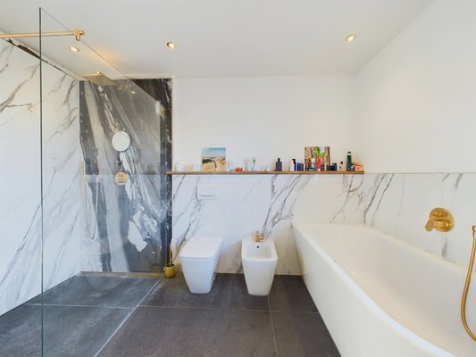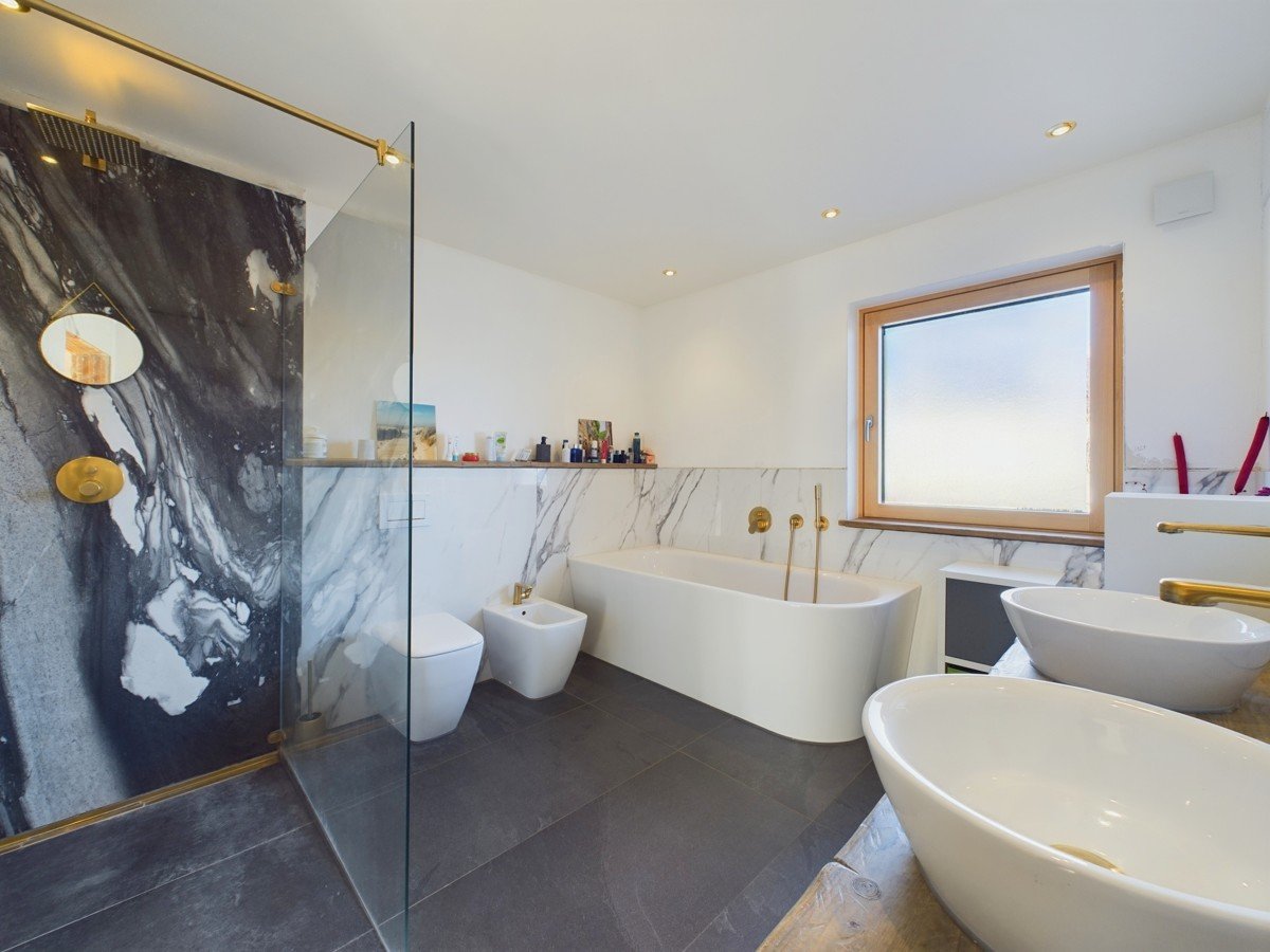 Im Obergeschoss erwarten Sie zwei großzügige Kinderzimmer sowie ein Gästezimmer. Eines der Kinderzimmer verfügt über einen eigenen Balkon, während ein weiterer Balkon sowohl vom Gästezimmer als auch vom zweiten Kinderzimmer aus zugänglich ist. Die Balkone müssen noh final fertiggestellt werden. Das moderne Badezimmer ist ein echtes Wellness-Highlight: Ausgestattet mit einer Badewanne, einer bodentiefen Dusche, zwei Waschbecken und edlen grau-weißen Marmorfliesen. Der Holzboden in den Wohnräumen unterstreicht die warme Atmosphäre.