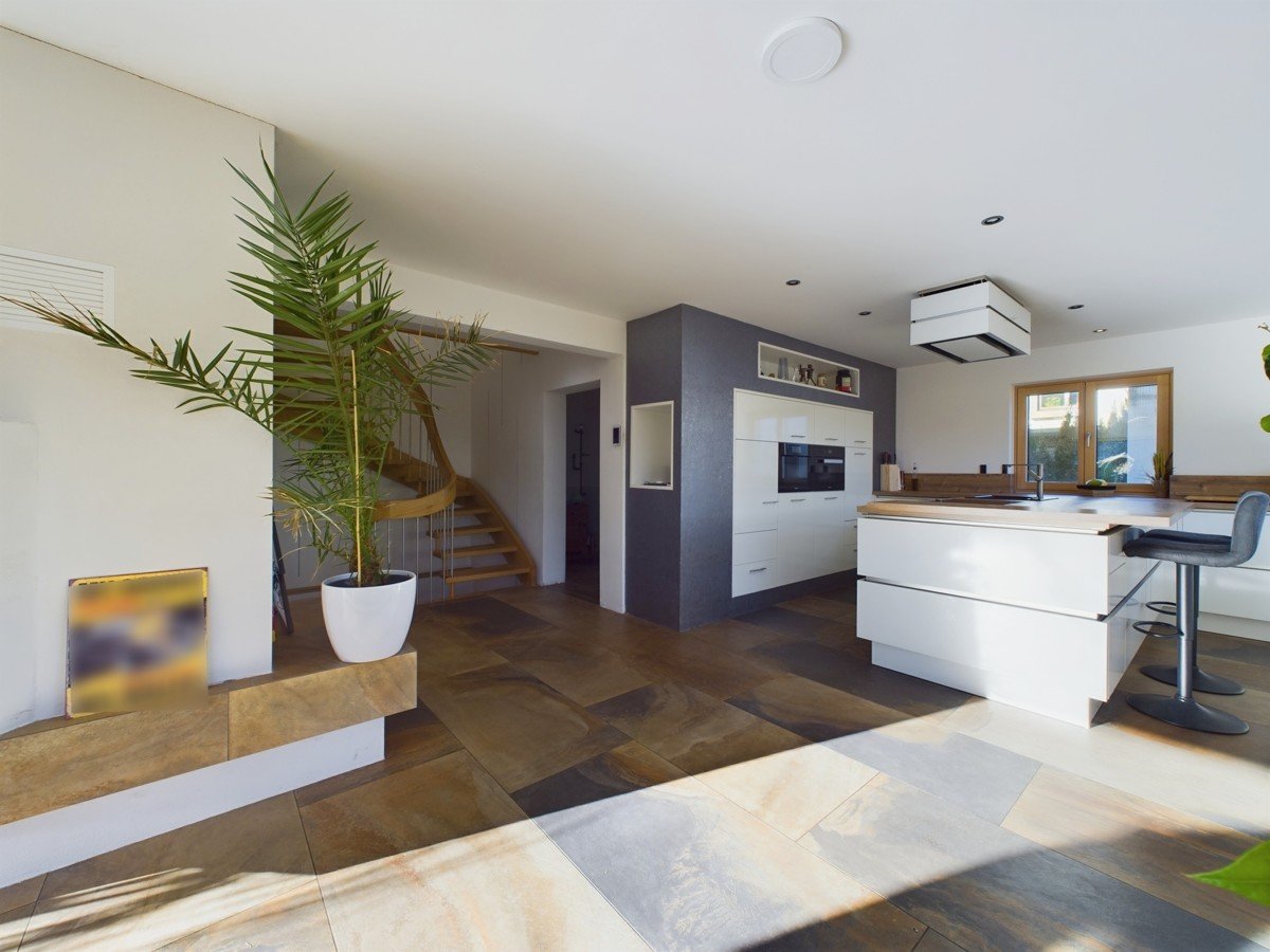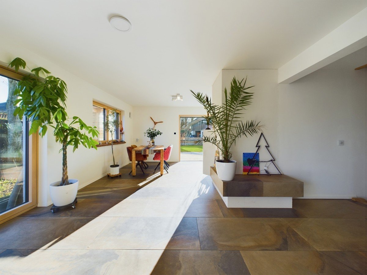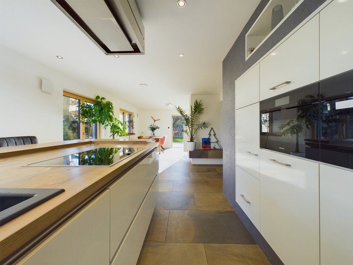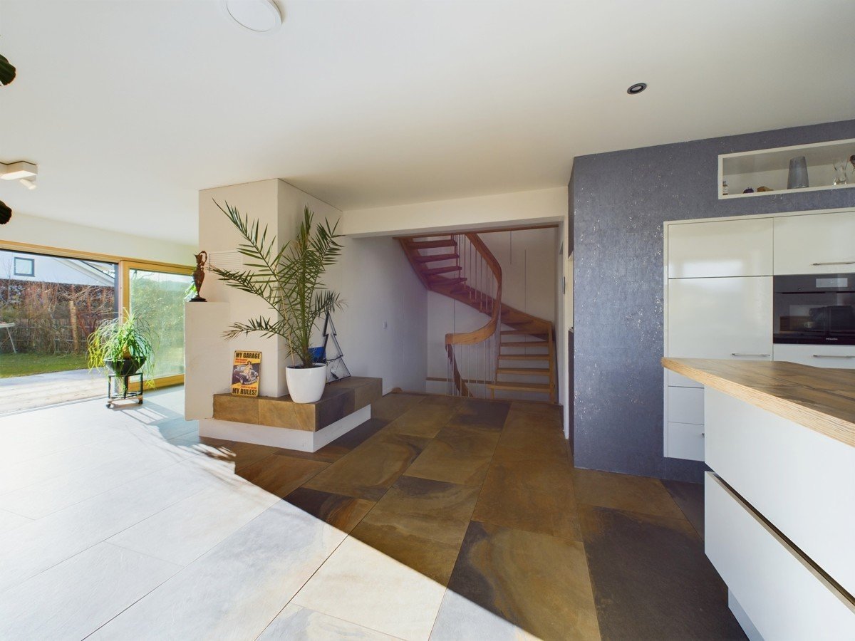 Das Herzstück des Hauses bildet der offene Wohn- und Essbereich mit 51 m², einem stilvollen Kachelofen und Zugang zur großen Sonnenterrasse. Die angrenzende, moderne, weiße Küche mit extra hohem Küchenblock und Theke ist ein Highlight für Hobbyköche. Der Eingangsbereich bietet eine geräumige Diele und ein elegantes Gäste-WC. Großformatige, moderne Fliesen verleihen dem Erdgeschoss eine helle und edle Ausstrahlung.