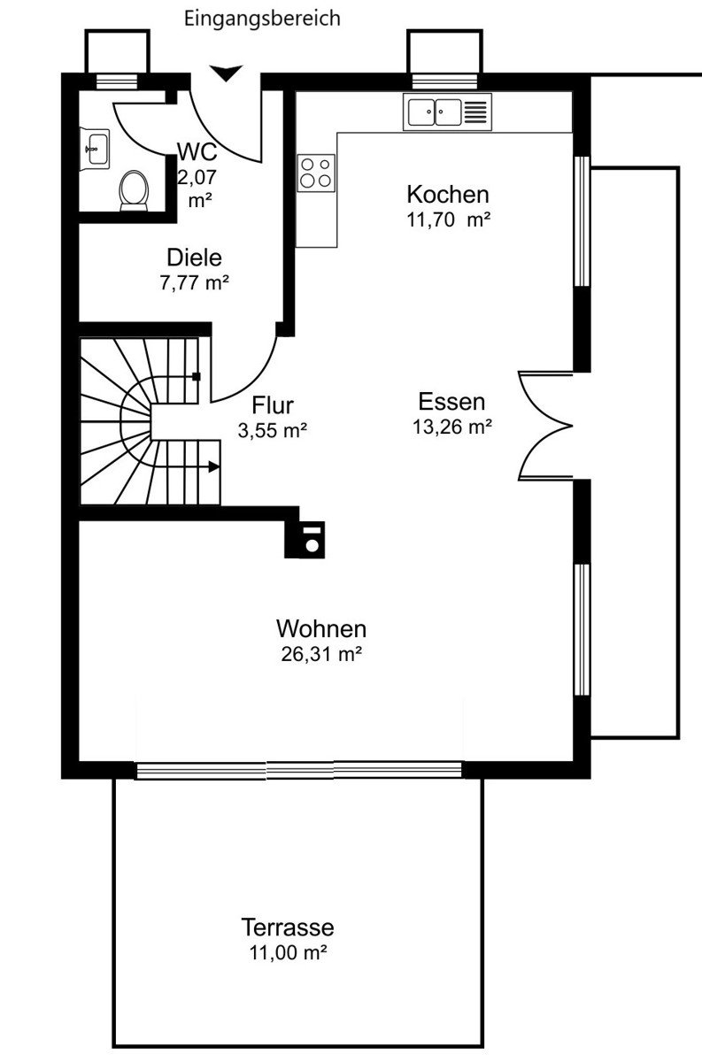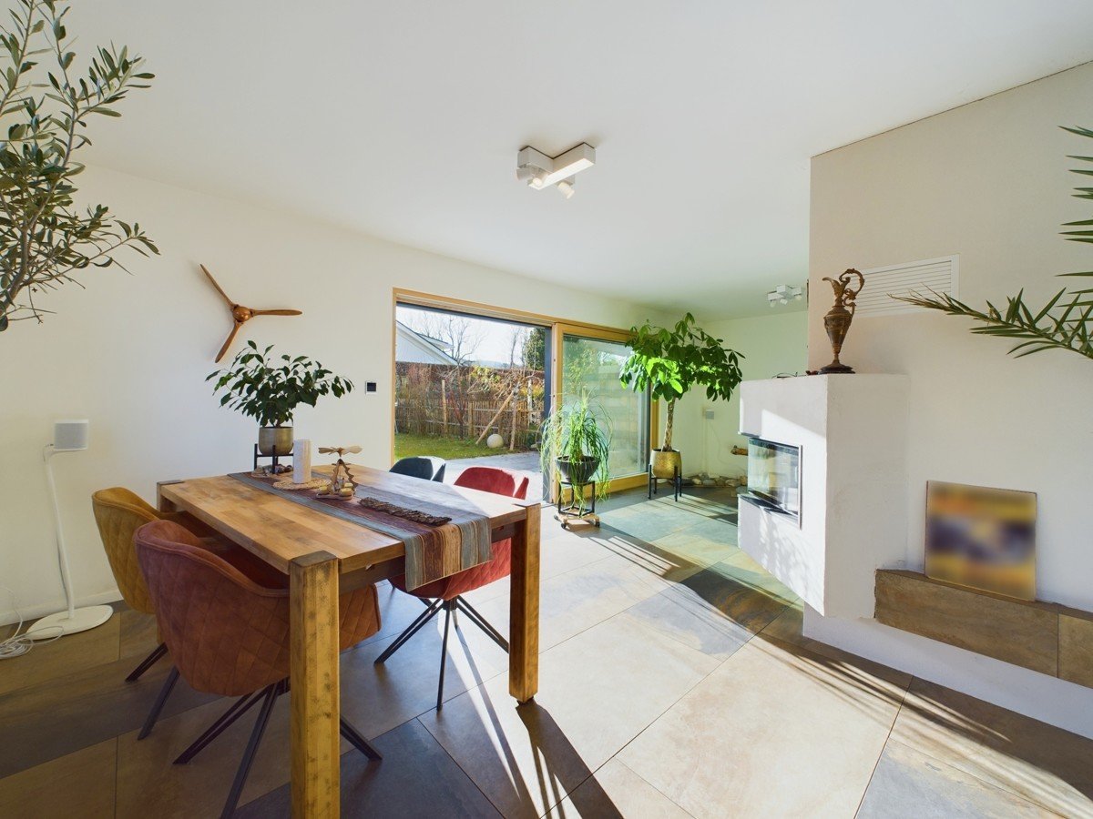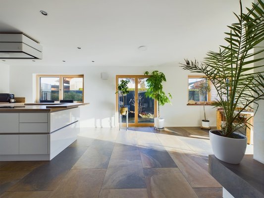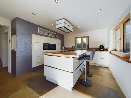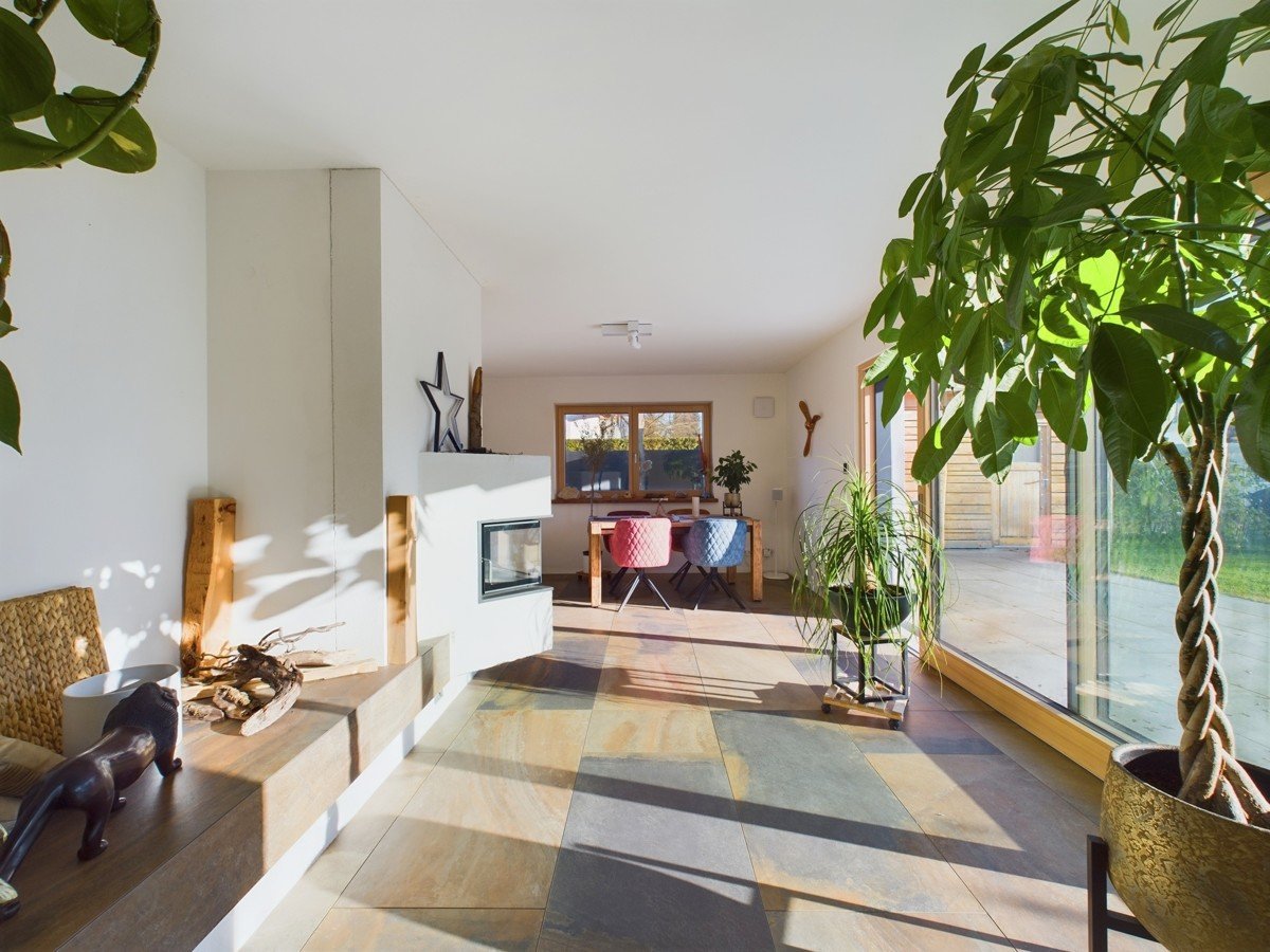 Das Herzstück des Hauses bildet der offene Wohn- und Essbereich mit 51 m², einem stilvollen Kachelofen und Zugang zur großen Sonnenterrasse. Die angrenzende, moderne, weiße Küche mit extra hohem Küchenblock und Theke ist ein Highlight für Hobbyköche. Der Eingangsbereich bietet eine geräumige Diele und ein elegantes Gäste-WC. Großformatige, moderne Fliesen verleihen dem Erdgeschoss eine helle und edle Ausstrahlung.