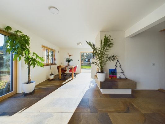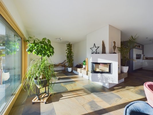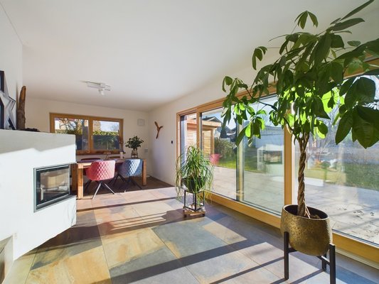 - Wohn- und Essbereich (ca. 51 m²) mit Kachelofen und Zugang zur Terrasse