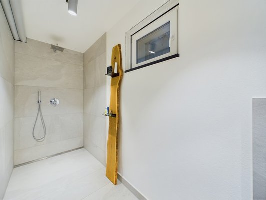 - Badezimmer mit bodentiefer Dusche (hellgrau und weiß gefliest)