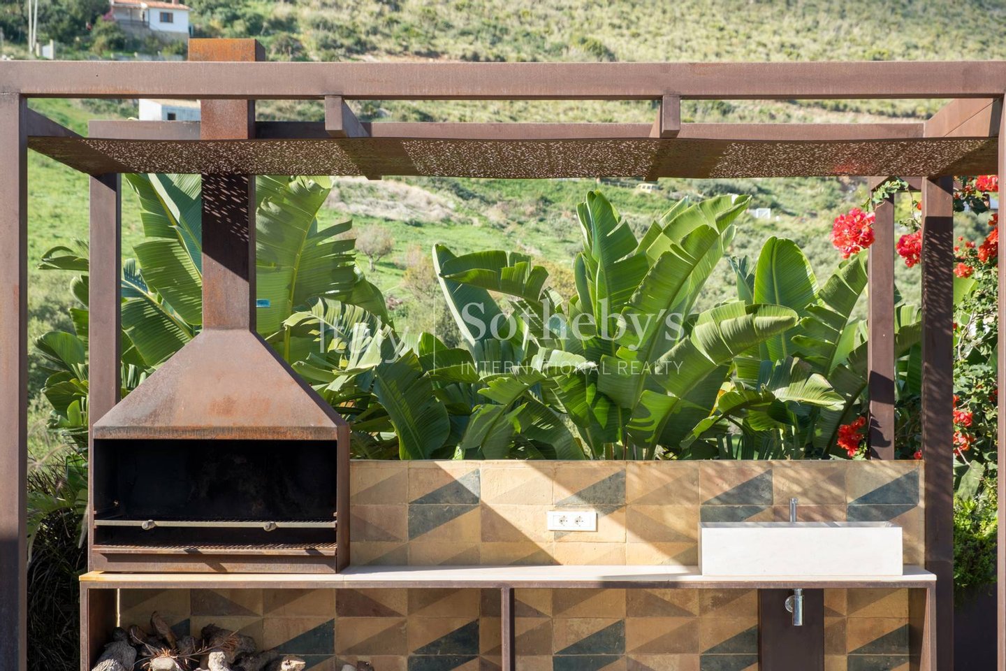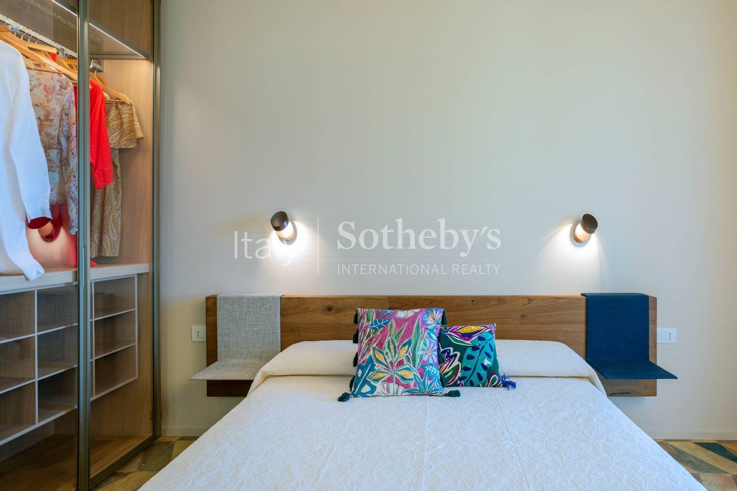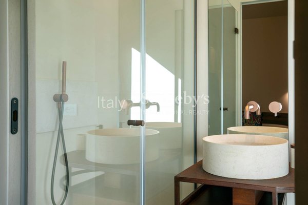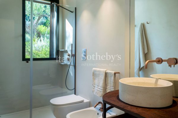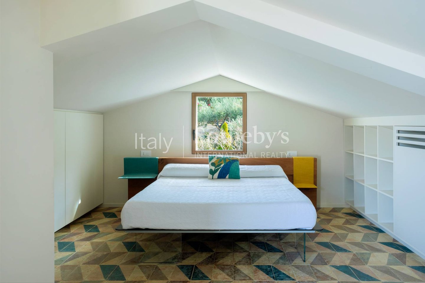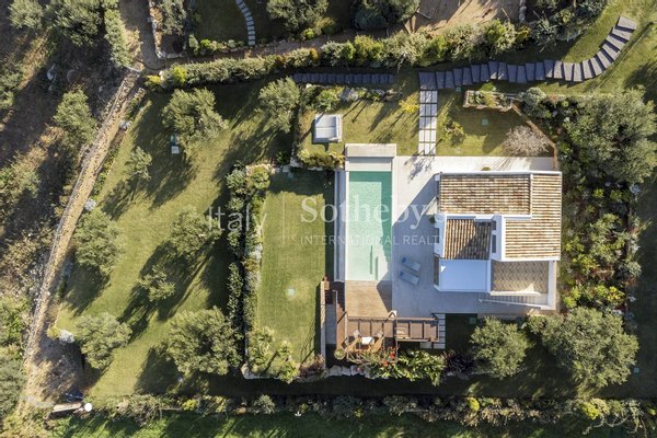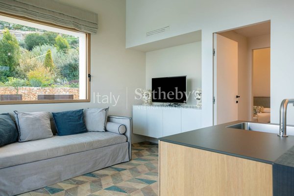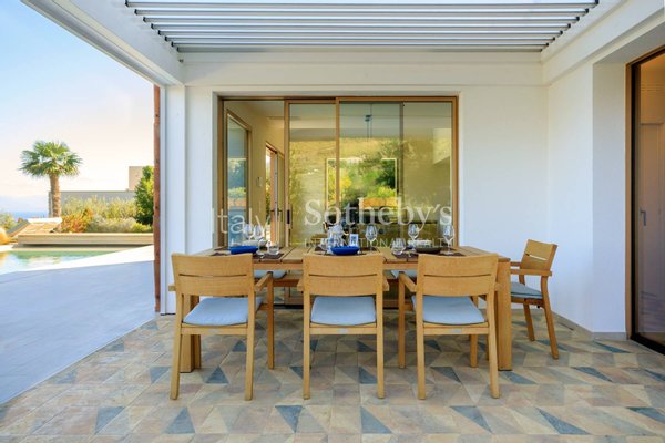 Draußen ist der Garten eine Oase der Ruhe, bereichert durch mediterrane Pflanzen und einen Infinity-Pool, der den Mittelpunkt der Immobilie bildet. Der Pool, der optisch mit dem Horizont verschmilzt, schafft einen einzigartigen szenischen Effekt, der Himmel und Meer verbindet.