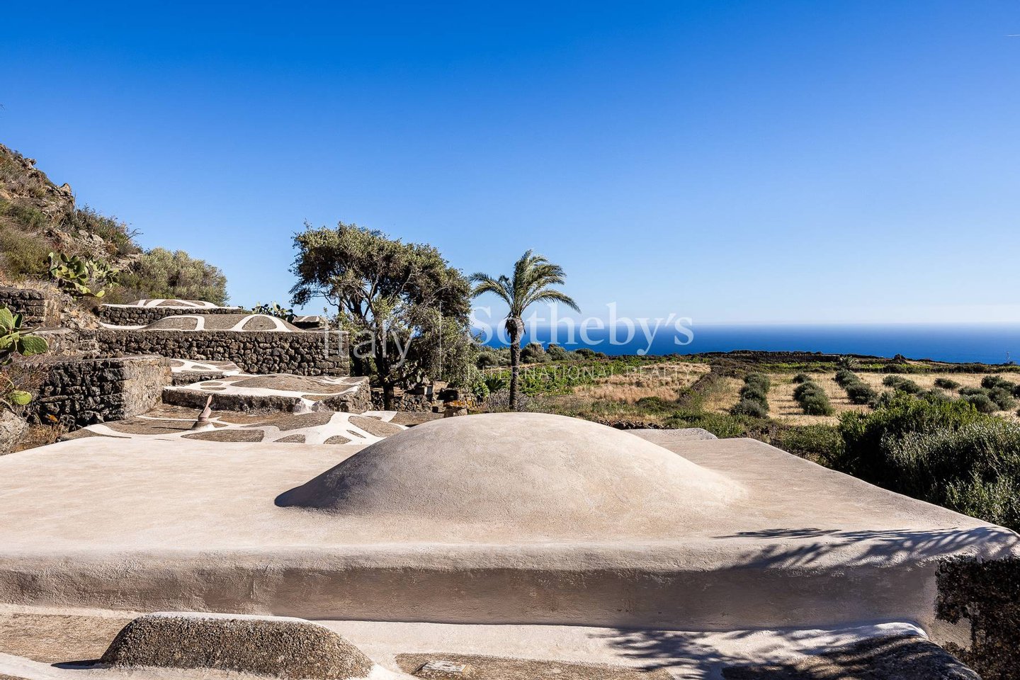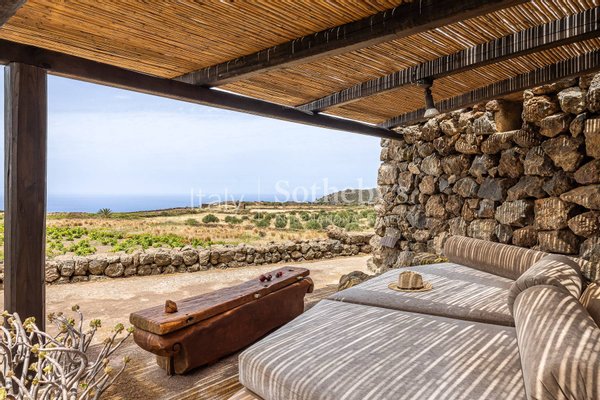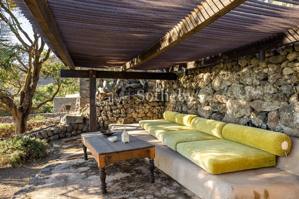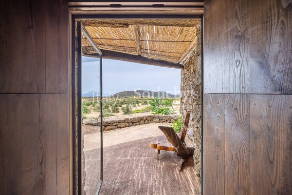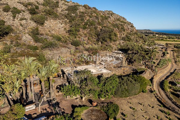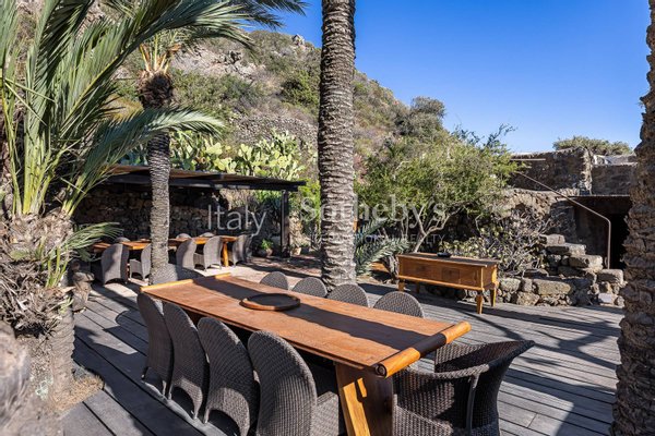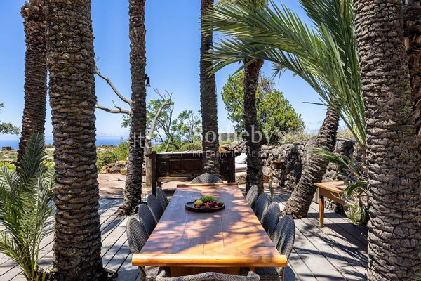 Ein wunderschönes Anwesen im Herzen der Natur von Pantelleria, mit atemberaubendem Blick. Die Immobilie fügt sich harmonisch in die Umgebung ein, die von Palmen, Olivenbäumen, Weinreben, Feigenkaktus, Bougainvillea und üppiger Mittelmeervegetation