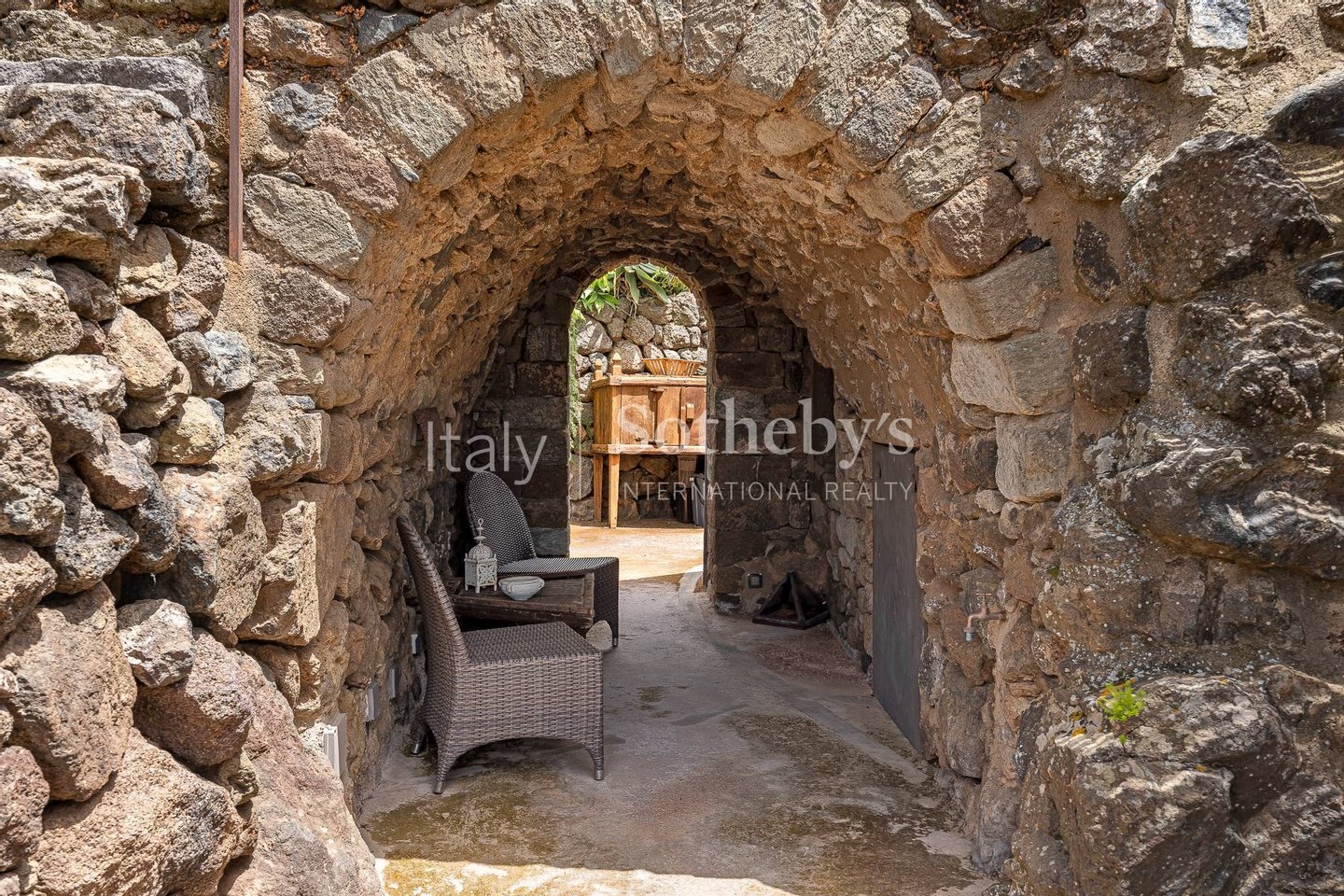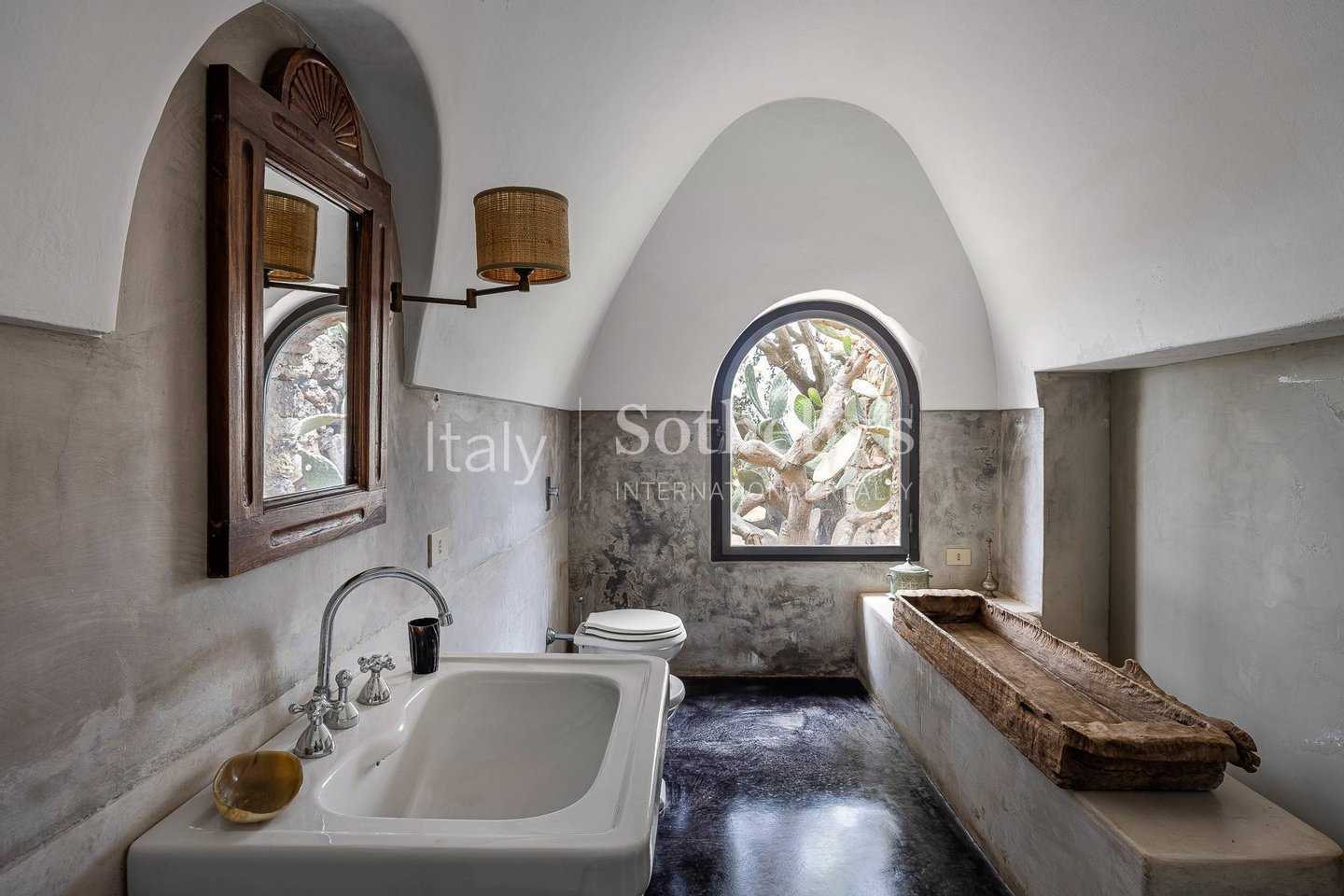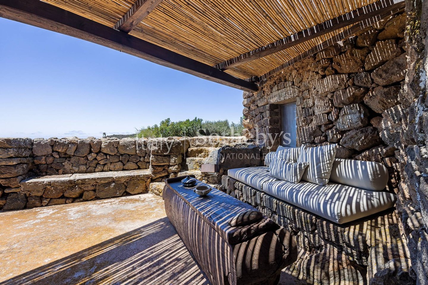 Ein wunderschönes Anwesen im Herzen der Natur von Pantelleria, mit atemberaubendem Blick. Die Immobilie fügt sich harmonisch in die Umgebung ein, die von Palmen, Olivenbäumen, Weinreben, Feigenkaktus, Bougainvillea und üppiger Mittelmeervegetation