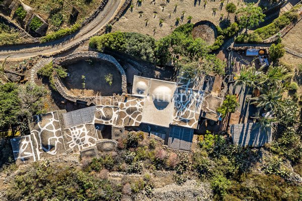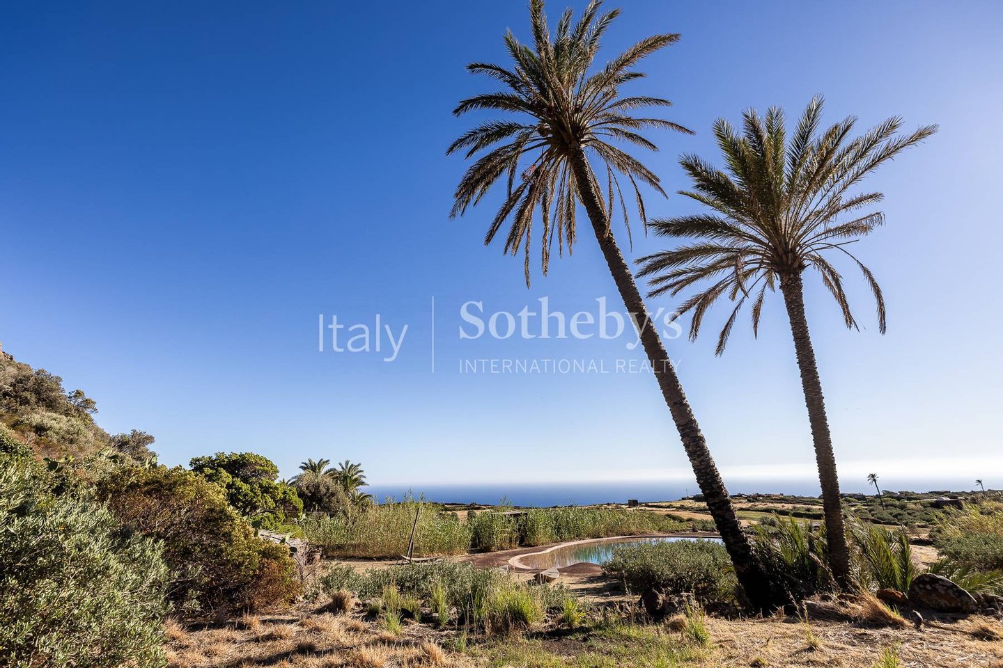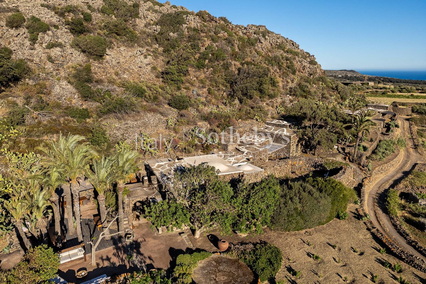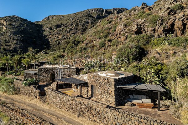 Ein wunderschönes Anwesen im Herzen der Natur von Pantelleria, mit atemberaubendem Blick. Die Immobilie fügt sich harmonisch in die Umgebung ein, die von Palmen, Olivenbäumen, Weinreben, Feigenkaktus, Bougainvillea und üppiger Mittelmeervegetation geprägt ist. Der große Pool, der farblich an einen Vulkankrater erinnert, bildet den Mittelpunkt des Außenbereichs. Der erste gesellige Bereich, umgeben von Palmen und ausgestattet mit zwei großen Esstischen und großzügigen Lounges, führt zum Hauptgebäude, das aus vier benachbarten Dammusi besteht.