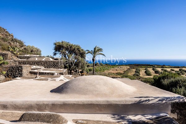 Ein wunderschönes Anwesen im Herzen der Natur von Pantelleria, mit atemberaubendem Blick. Die Immobilie fügt sich harmonisch in die Umgebung ein, die von Palmen, Olivenbäumen, Weinreben, Feigenkaktus, Bougainvillea und üppiger Mittelmeervegetation