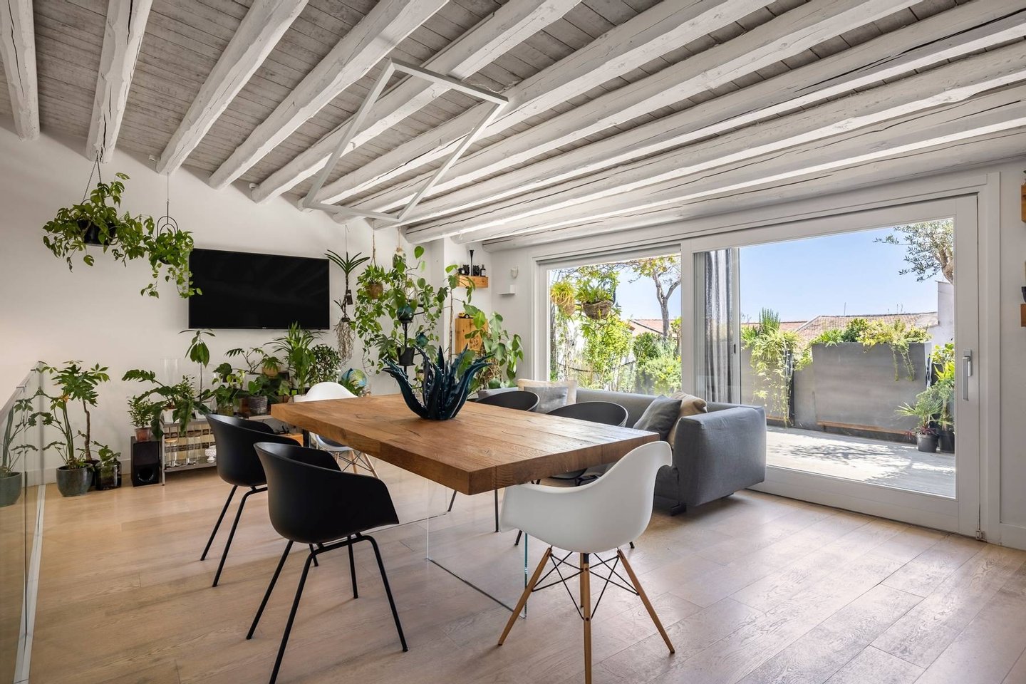 Im ersten Stock empfängt der Eingangsbereich mit einem eleganten Flur, der in ein helles Wohnzimmer mit Kamin und Balkon führt. Auf dieser Ebene befinden sich auch zwei Schlafzimmer, eines davon mit begehbarem Kleiderschrank und eigenem Badezimmer sowie ein weiteres Badezimmer für Gäste. Über eine Treppe gelangt man in die zweite Etage, wo sich ein großzügiger Wohnbereich mit offener Küche befindet. Ebenfalls auf dieser Ebene befindet sich ein drittes Badezimmer.