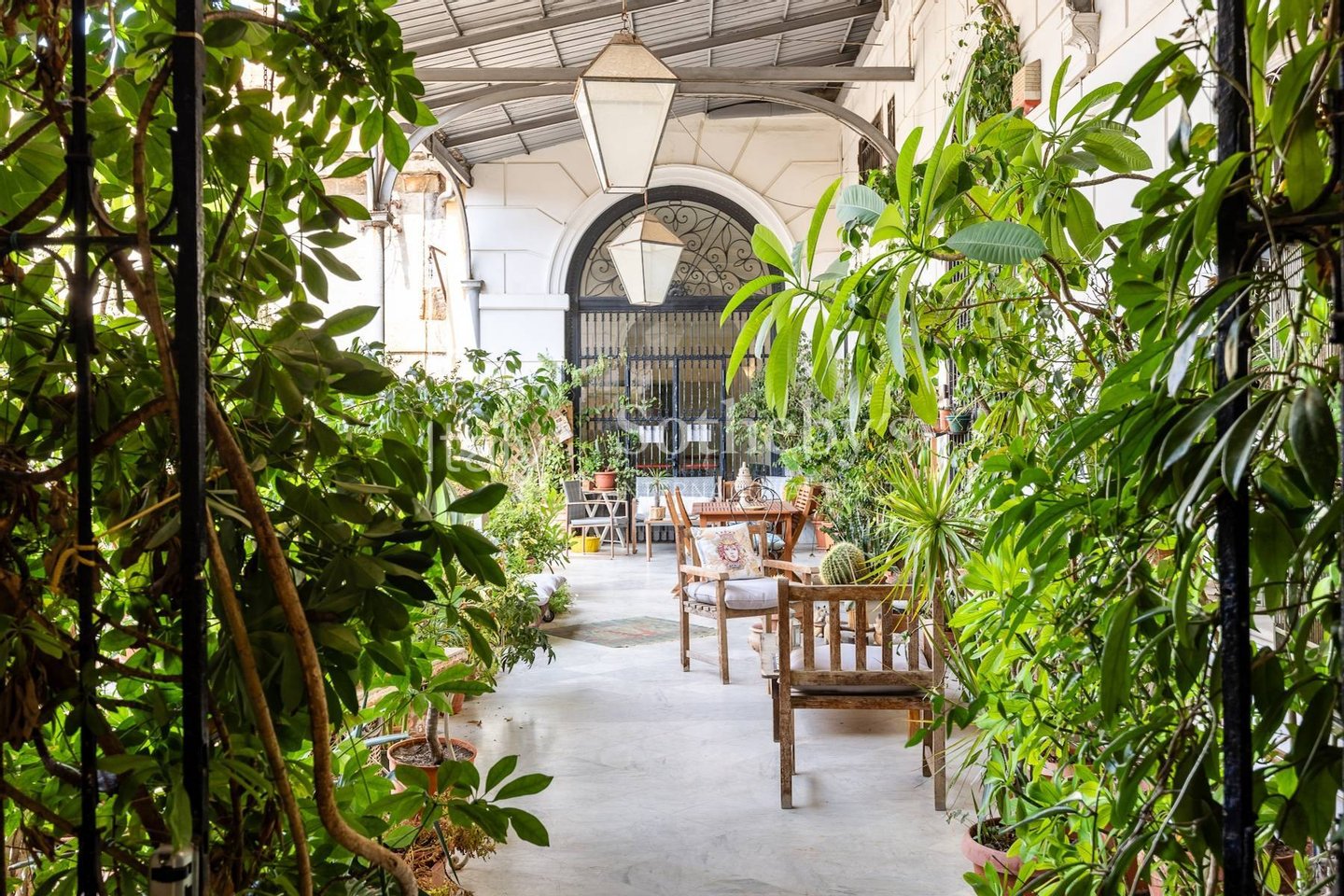 Zwischen dem Dienstboteneingang und einem der Salons befindet sich ein reizvoller Raum, von dem aus eine weiß lackierte Eisentreppe in das obere Stockwerk führt, das aus einem großen Flur, zwei Schlafzimmern und zwei Bädern besteht. Vom Dachboden der Wohnung hat man Zugang zur gemeinschaftlichen, jedoch exklusiv zugänglichen Terrasse von etwa 120 m², die in der Mitte einen majestätischen Pavillon aus Eisen und Glas aufweist: das Oberlicht der monumentalen Treppe des Palastes.
