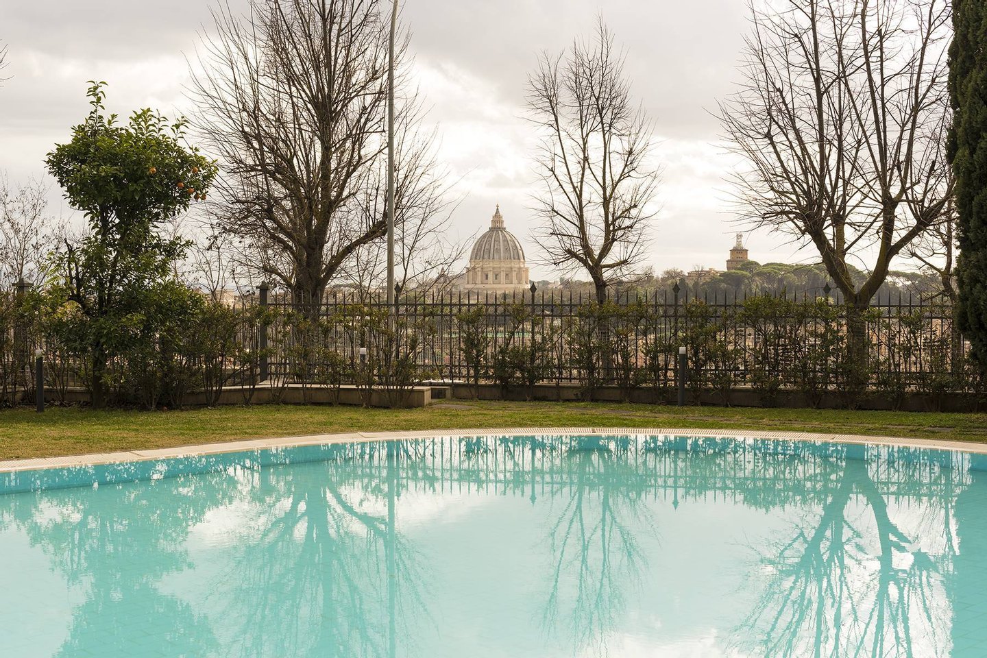 Located in an exclusive residential complex with a panoramic communal pool, this refined apartment enjoys a privileged position with breathtaking views of Rome's Historic Center and St. Peter's Dome.