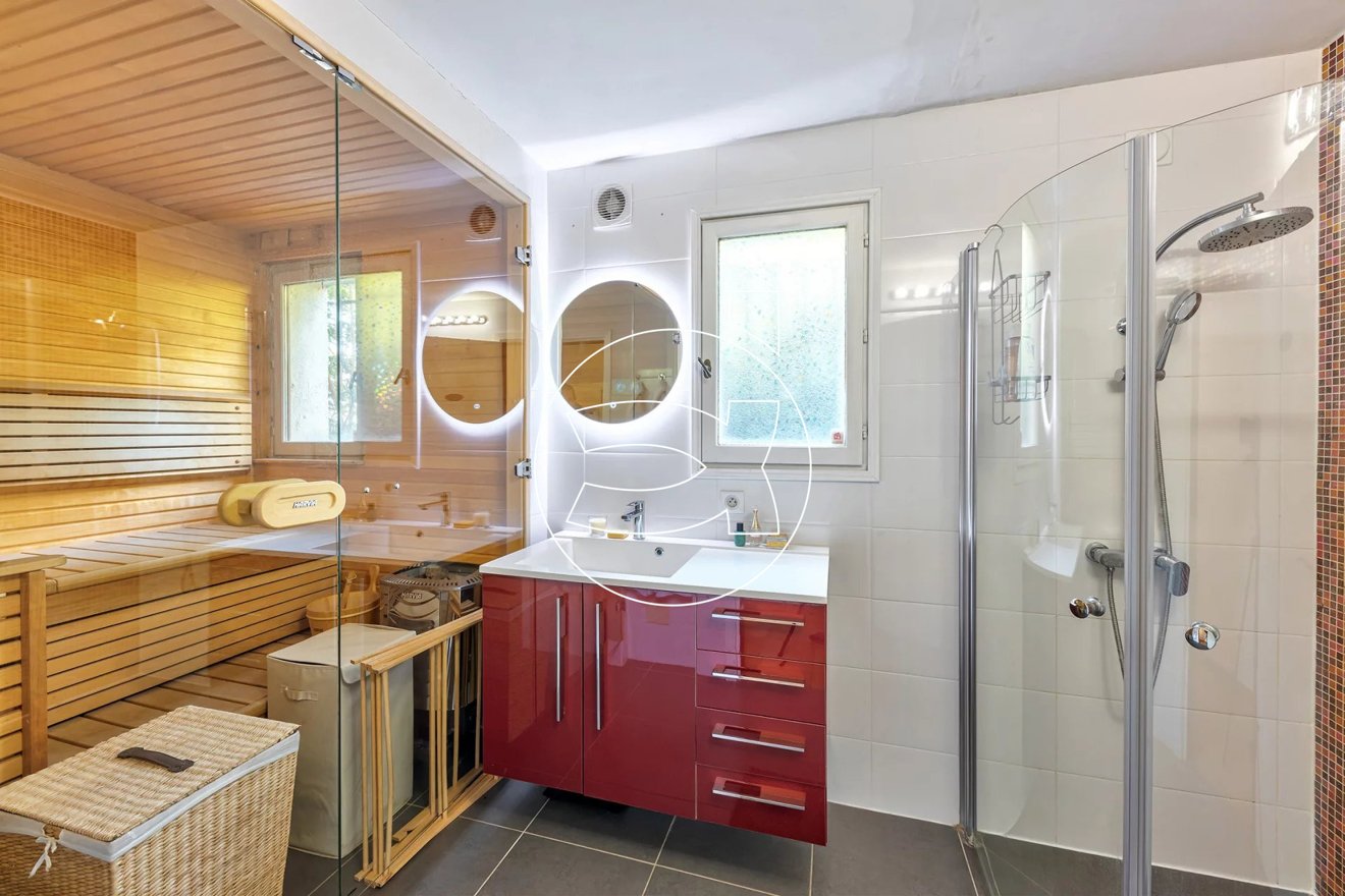 Die moderne, gut ausgestattete Küche wurde kürzlich renoviert und wird durch eine zweite Küche ergänzt, die problemlos in eine Garage umgewandelt werden kann. Ein vollständig renoviertes Badezimmer, das eine maßgefertigte Sauna umfasst, sowie 2 weitere Schlafzimmer sind ebenfalls vorhanden.