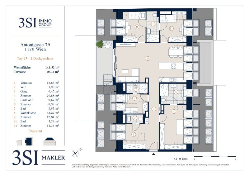Diese traumhafte Penthousewohnung ist ein echtes Juwel und verspricht Wohnen auf höchstem Niveau. Der weitläufige Wohnbereich, durchflutet von natürlichem Licht, öffnet sich direkt zu einer herrlichen Terrasse – ein Ort, an dem Sie den Alltag hinter sich lassen und die Seele baumeln lassen können. Die vier eleganten Schlafzimmer, jedes mit einem eigenen luxuriösen Badezimmer ausgestattet, bieten Raum für Rückzug und Erholung. Die südwestliche Ausrichtung sorgt für eine warme, einladende Atmosphäre und fängt die schönsten Lichtmomente des Tages ein. Absolutes Highlight ist die atemberaubende Dachterrasse, die Ihnen einen unvergleichlichen Blick schenkt und mit vorbereiteten Anschlüssen für einen Whirlpool perfekt für unvergessliche Abende unter freiem Himmel ist. Dieses Zuhause wird Sie begeistern und Ihr Herz höherschlagen lassen.