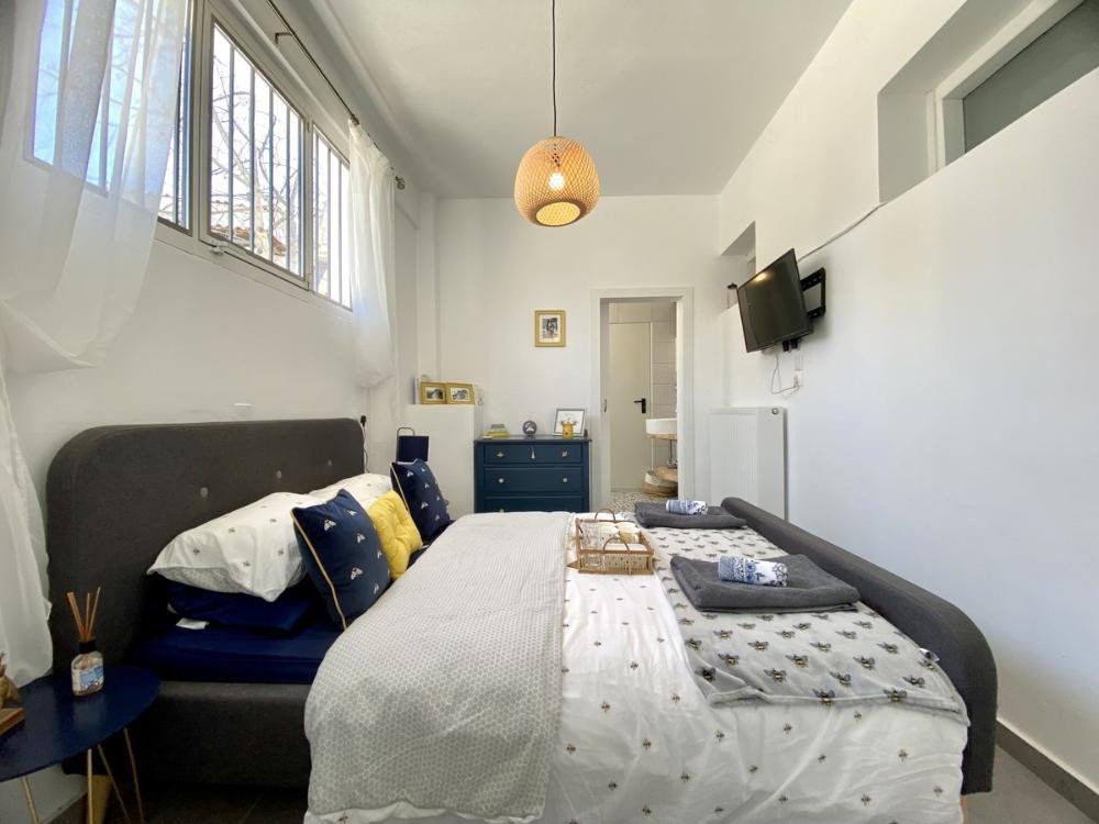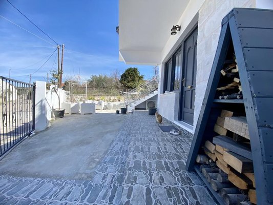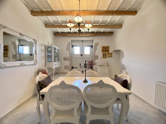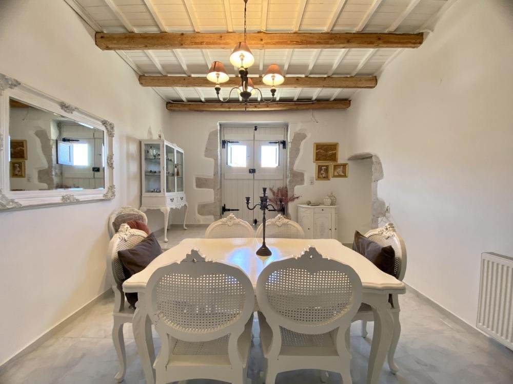 Das Esszimmer mit seinen traditionellen Doppeltüren führt auf die Seite der Villa und die Straße. Es gibt einen kleinen Steineingang, der in die Küche führt, damit Sie Ihrer Familie und Ihren Freunden die traditionelle griechische Küche leicht zugänglich machen können.