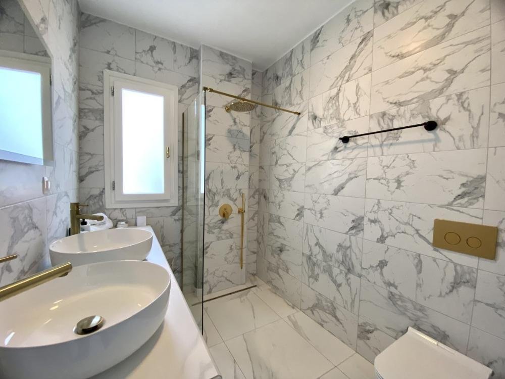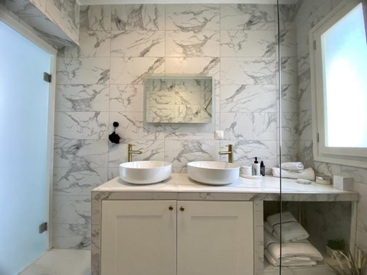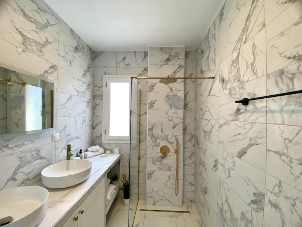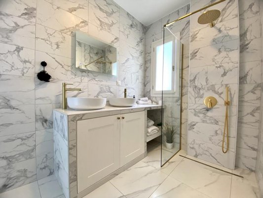 Die Master-Suite verfügt über ein großes Ankleidezimmer mit einer schönen freistehenden freistehenden Badewanne und Stauraum im Kleiderschrank. Durch einen Steinbogen betreten Sie das Schlafzimmer und wachen jeden Tag mit wunderschönem Meerblick auf. Durch die Terrassentüren und die Pergola gelangen Sie auf die große Dachterrasse und den Essbereich mit herrlichem Meer- und Bergblick. Das eigene Badezimmer verfügt über schöne Funktionen mit begehbarer Regendusche, Stauraum unter dem Waschbecken und Waschbecken für Sie und Ihn.
